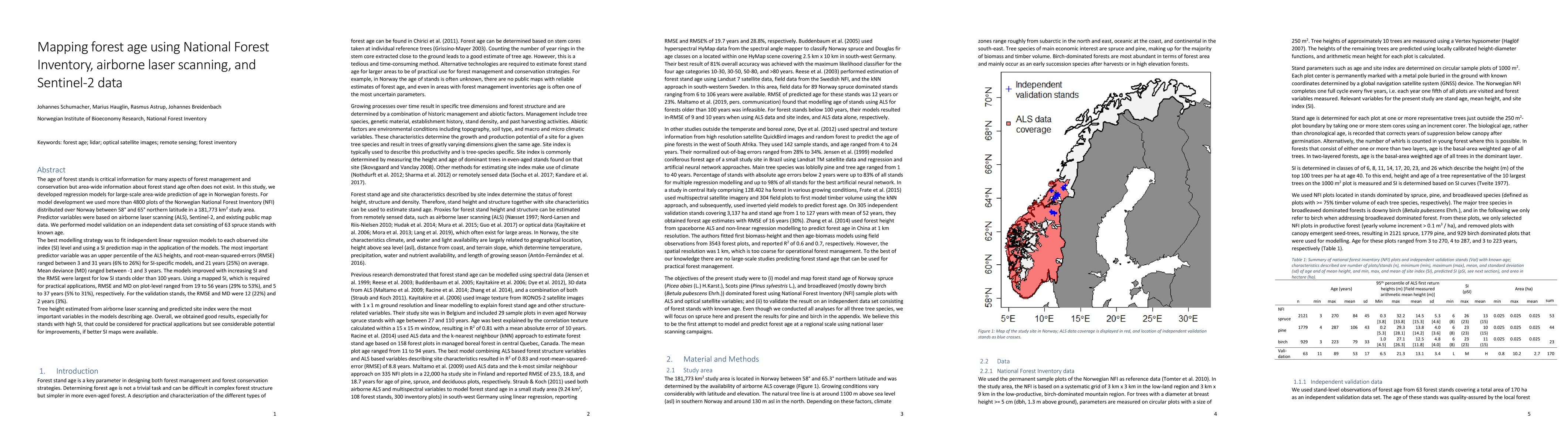 This study developed regression models to predict forest stand age in Norwegian forests using National Forest Inventory plots, airborne laser scanning, Sentinel-2 data, and public map data. The best approach involved fitting independent linear regression models for each site index level, achieving RMSE between 3 and 56 years, with the most important predictors being ALS heights and site index.