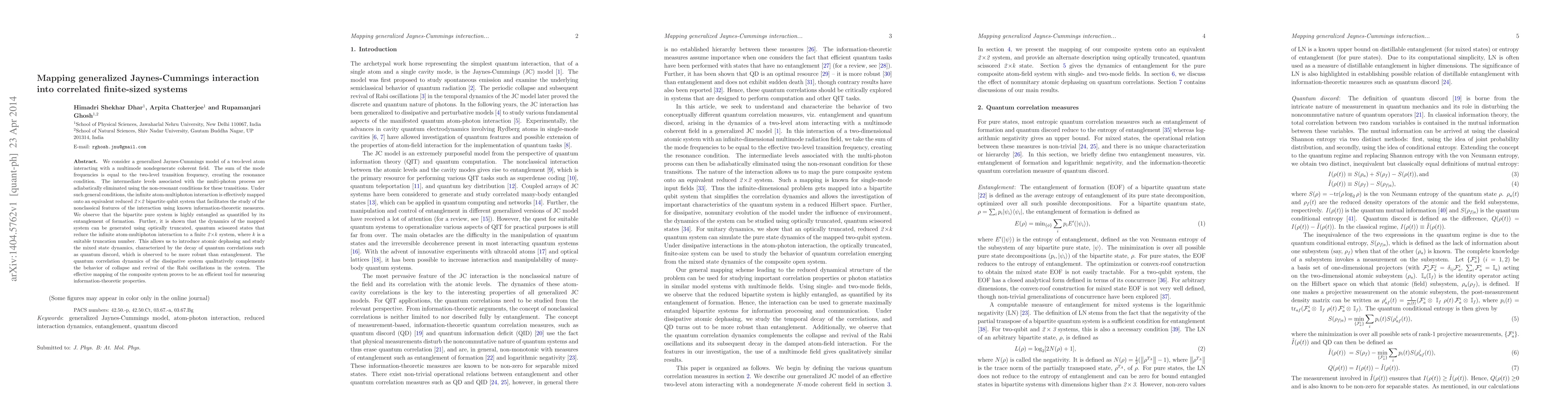 We consider a generalized Jaynes-Cummings model of a two-level atom interacting with a multimode nondegenerate coherent field. The sum of the mode frequencies is equal to the two-level transition frequency, creating the resonance condition. The intermediate levels associated with the multi-photon process are adiabatically eliminated using the non-resonant conditions for these transitions. Under such general conditions, the infinite atom-multiphoton interaction is effectively mapped onto an equivalent reduced \textit{2}$\times$\textit{2} bipartite qubit system that facilitates the study of the nonclassical features of the interaction using known information-theoretic measures. We observe that the bipartite pure system is highly entangled as quantified by its entanglement of formation. Further, it is shown that the dynamics of the mapped system can be generated using optically truncated, quantum scissored states that reduce the infinite atom-multiphoton interaction to a finite \textit{2}$\times$\textit{k} system, where $k$ is a suitable truncation number. This allows us to introduce atomic dephasing and study the mixed state dynamics, characterized by the decay of quantum correlations such as quantum discord, which is observed to be more robust than entanglement. The quantum correlation dynamics of the dissipative system qualitatively complements the behavior of collapse and revival of the Rabi oscillations in the system. The effective mapping of the composite system proves to be an efficient tool for measuring information-theoretic properties.