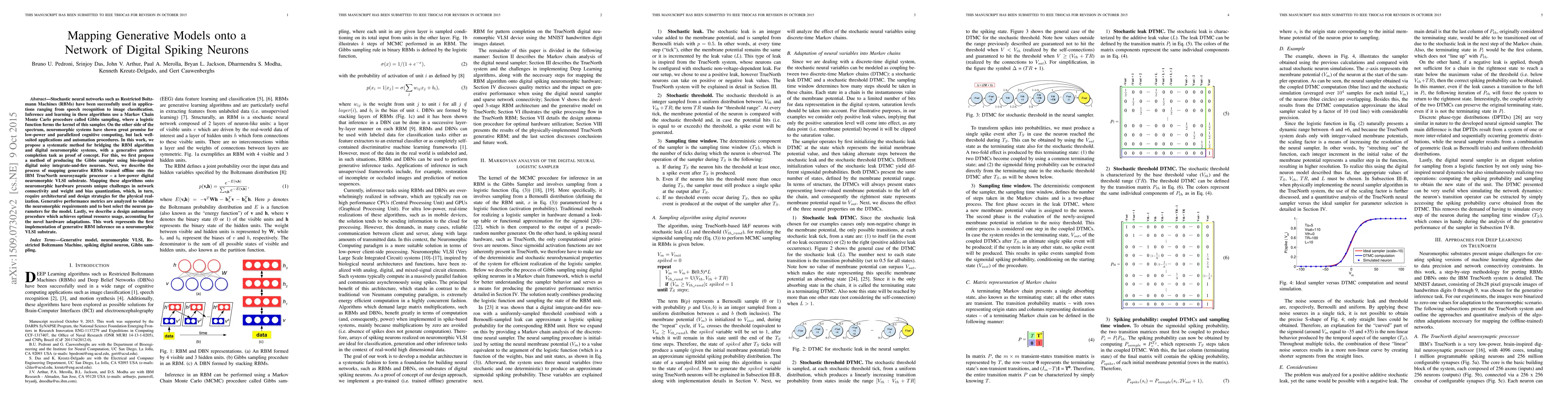 This paper proposes a method to map Restricted Boltzmann Machines (RBMs) onto a network of digital spiking neurons, specifically the IBM TrueNorth processor, to leverage the low-power benefits of neuromorphic systems. It introduces a generative pattern completion task to demonstrate the feasibility of this mapping, addressing challenges in network connectivity and weight quantization, and presents a design automation procedure for optimal resource usage.
