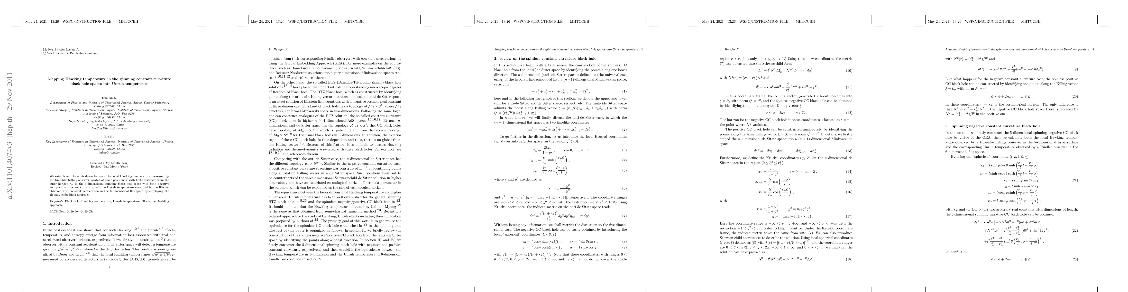 We established the equivalence between the local Hawking temperature measured by the time-like Killing observer located at some positions $r$ with finite distances from the outer horizon $r_+$ in the 5-dimensional spinning black hole space with both negative and positive constant curvature, and the Unruh temperature measured by the Rindler observer with constant acceleration in the 6-dimensional flat space by employing the globally embedding approach.