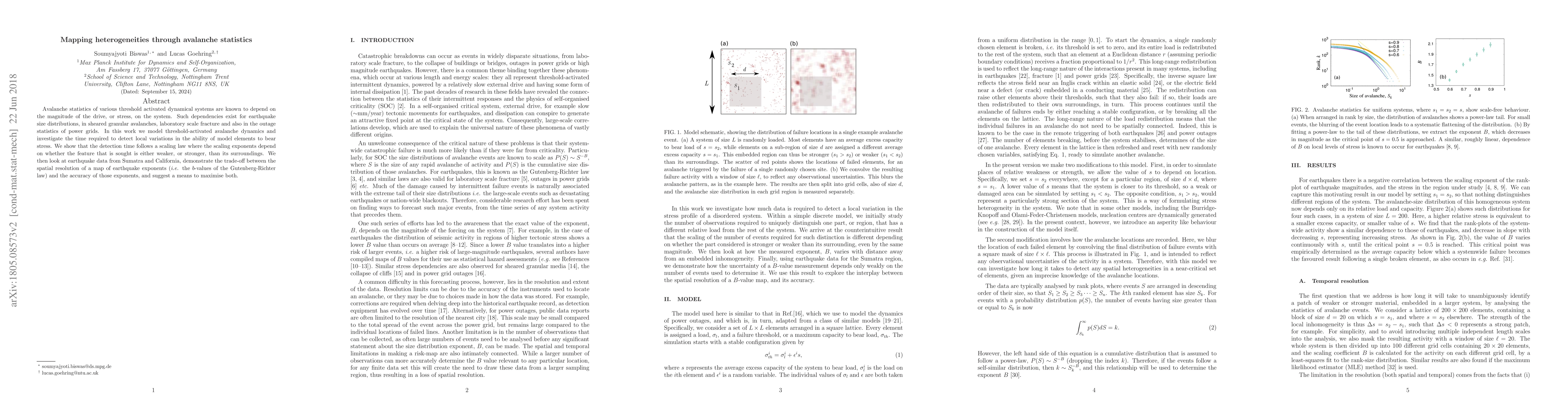 The research models threshold-activated avalanche dynamics to investigate the time required for detecting local variations in stress-bearing capacity of model elements. It explores the trade-off between spatial resolution and accuracy in mapping earthquake exponents (b-values) using data from Sumatra and California.