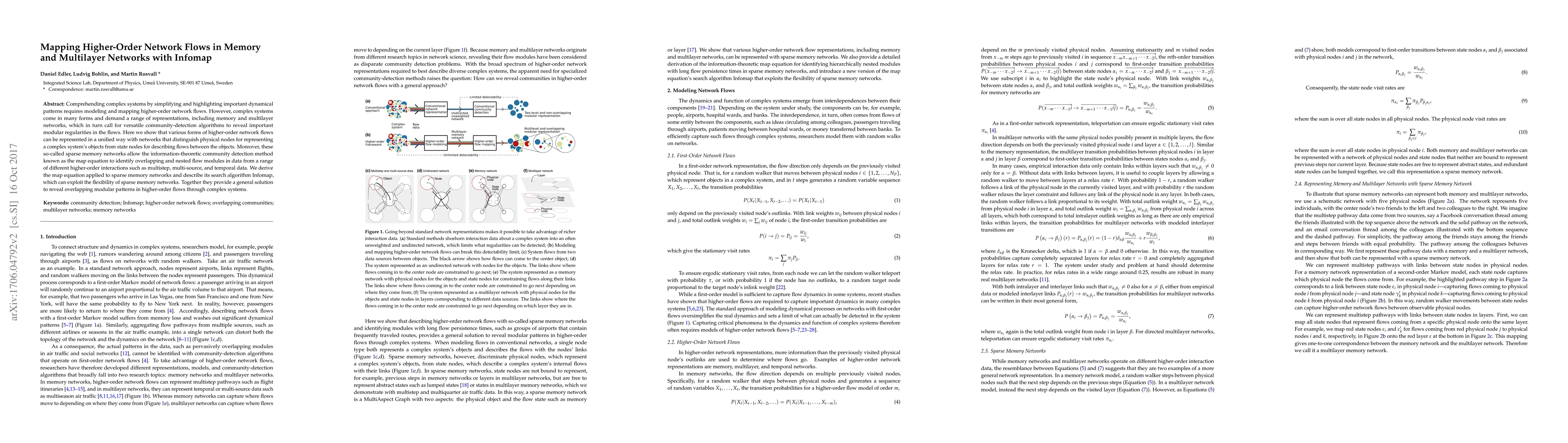 The research introduces Infomap, a versatile community-detection algorithm that uses the map equation for identifying overlapping and nested flow modules in higher-order network flows. It represents various forms of higher-order network flows using sparse memory networks, which distinguish physical nodes for system objects from state nodes for describing flows between objects.
