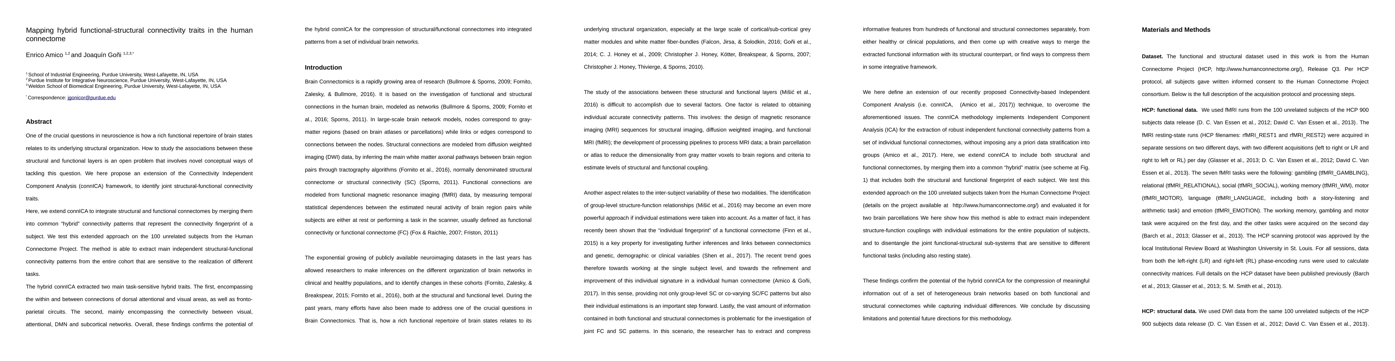 This paper proposes an extended Connectivity Independent Component Analysis (connICA) framework to identify joint structural-functional connectivity traits in the human brain. The hybrid connICA method successfully extracts two main task-sensitive hybrid connectivity patterns from the Human Connectome Project dataset, highlighting the potential of this approach for integrating structural and functional brain networks.