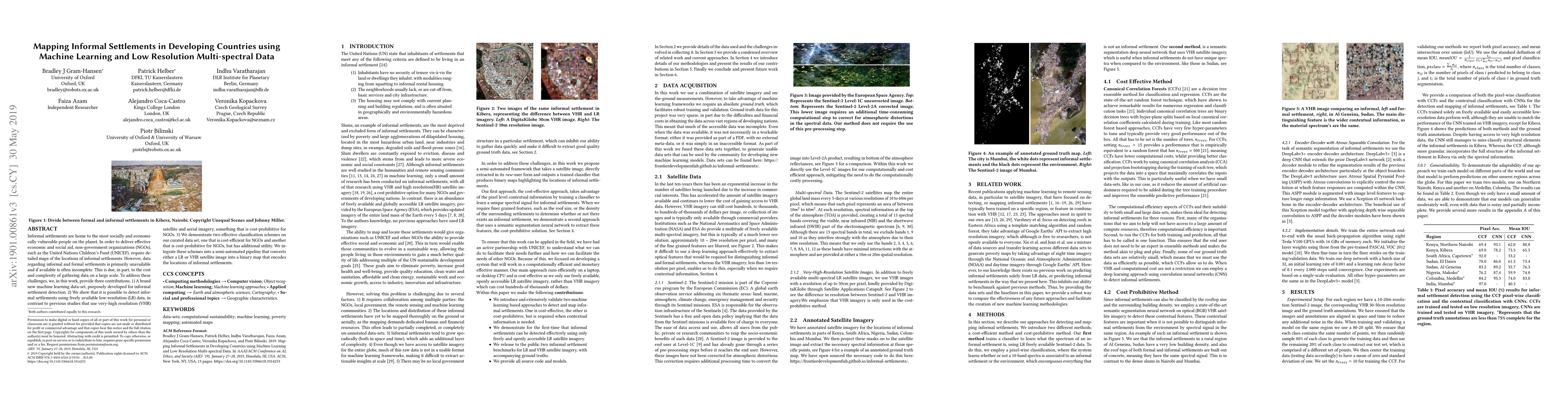 This paper introduces a machine learning dataset for detecting informal settlements and demonstrates that low-resolution multi-spectral data can be used effectively, unlike previous high-cost methods. It presents two classification schemes integrated into a semi-automated pipeline for mapping these settlements, aiding NGOs in delivering aid.