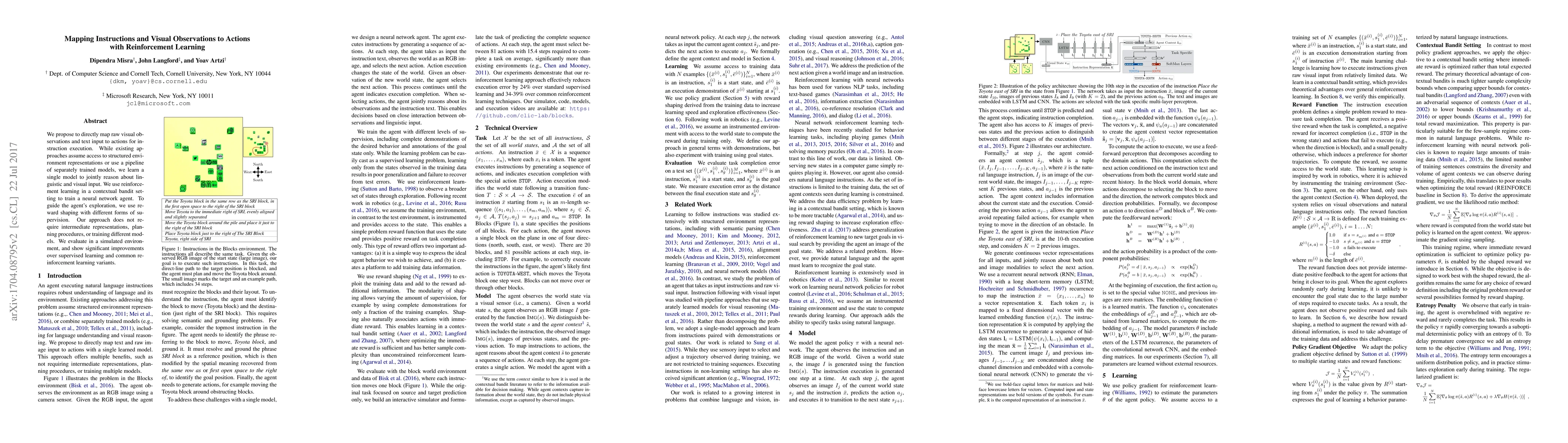 This paper proposes a reinforcement learning method to directly map visual observations and textual instructions to actions, eliminating the need for intermediate representations or separate models. The approach uses reward shaping to guide the neural network agent's exploration, demonstrating significant improvements over supervised learning and other reinforcement learning methods in a simulated environment.