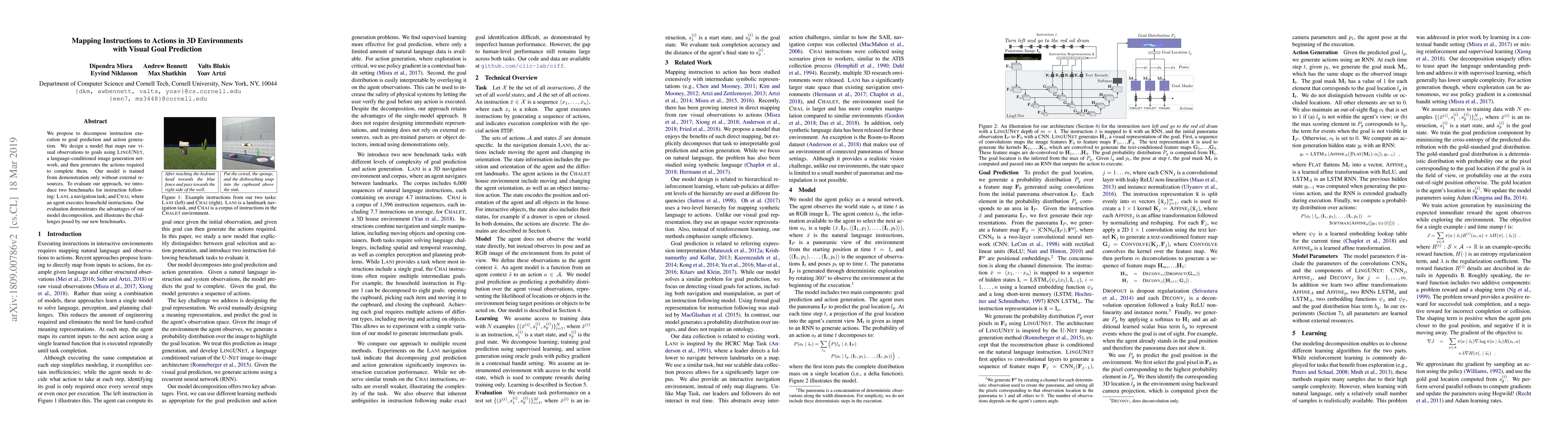 This paper introduces a model that decomposes instruction execution into goal prediction and action generation, using LINGUNET to predict goals from visual observations and generate actions to achieve them. The model is trained solely from demonstrations and evaluated on two new benchmarks, LANI and CHAI, showcasing its effectiveness and the challenges of the new benchmarks.
