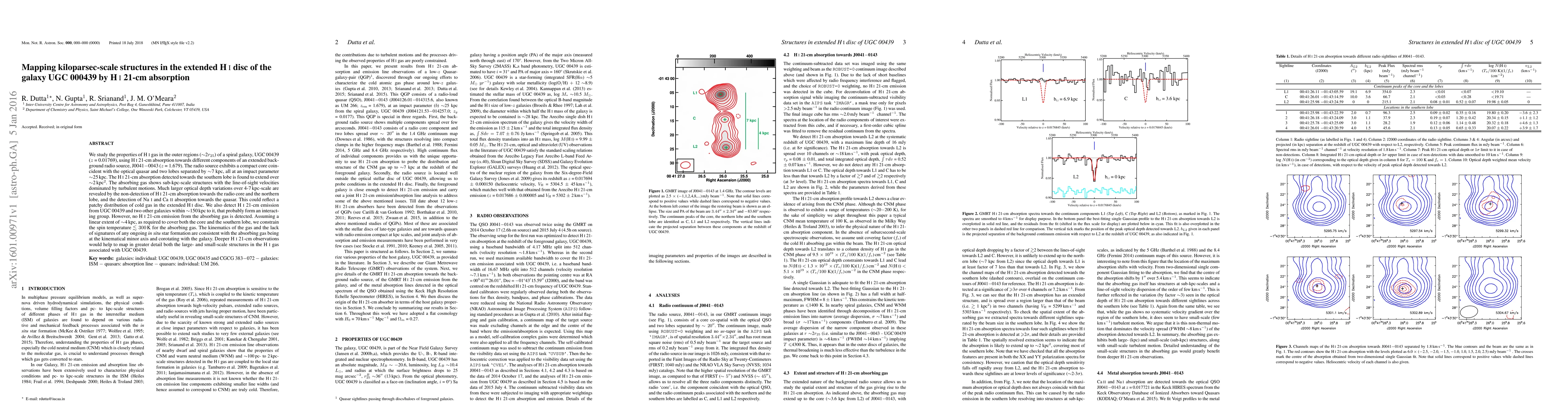 We study the properties of HI gas in the outer regions (~2r_25) of a spiral galaxy, UGC 00439 (z = 0.01769), using HI 21-cm absorption towards different components of an extended background radio source, J0041$-$0043 (z = 1.679). The radio source exhibits a compact core coincident with the optical quasar and two lobes separated by ~7 kpc, all at an impact parameter ~25 kpc. The HI 21-cm absorption detected towards the southern lobe is found to extend over ~2 kpc^2. The absorbing gas shows sub-kpc-scale structures with the line-of-sight velocities dominated by turbulent motions. Much larger optical depth variations over 4-7 kpc-scale are revealed by the non-detection of HI 21-cm absorption towards the radio core and the northern lobe, and the detection of NaI and CaII absorption towards the quasar. This could reflect a patchy distribution of cold gas in the extended HI disc. We also detect HI 21-cm emission from UGC 00439 and two other galaxies within ~150 kpc to it, that probably form an interacting group. However, no HI 21-cm emission from the absorbing gas is detected. Assuming a linear extent of ~4 kpc, as required to cover both the core and the southern lobe, we constrain the spin temperature <~300 K for the absorbing gas. The kinematics of the gas and the lack of signatures of any ongoing in situ star formation are consistent with the absorbing gas being at the kinematical minor axis and corotating with the galaxy. Deeper HI 21-cm observations would help to map in greater detail both the large- and small-scale structures in the HI gas associated with UGC 00439.