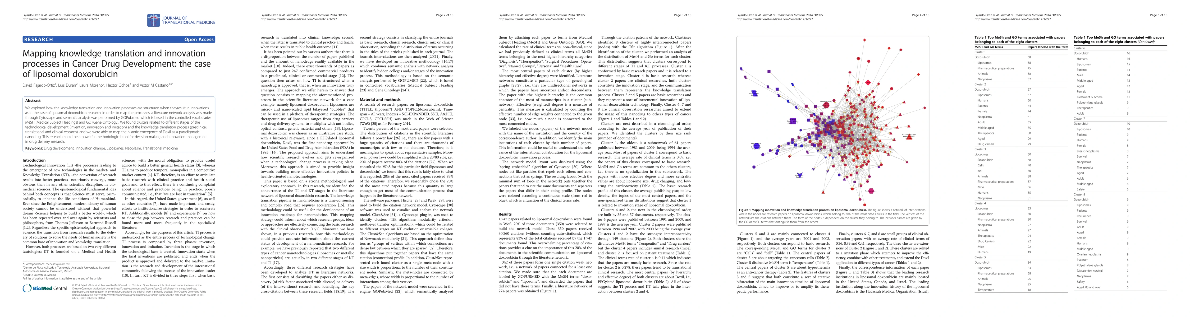 We explored how the knowledge translation and innovation processes are structured when they result in innovations, as in the case of liposomal doxorubicin research. In order to map the processes, a literature network analysis was made through Cytoscape and semantic analysis was performed by GOPubmed which is based in the controlled vocabularies MeSH (Medical Subject Headings) and GO (Gene Ontology). We found clusters related to different stages of the technological development (invention, innovation and imitation) and the knowledge translation process (preclinical, translational and clinical research), and we were able to map the historic emergence of Doxil as a paradigmatic nanodrug. This research could be a powerful methodological tool for decision-making and innovation management in drug delivery research.