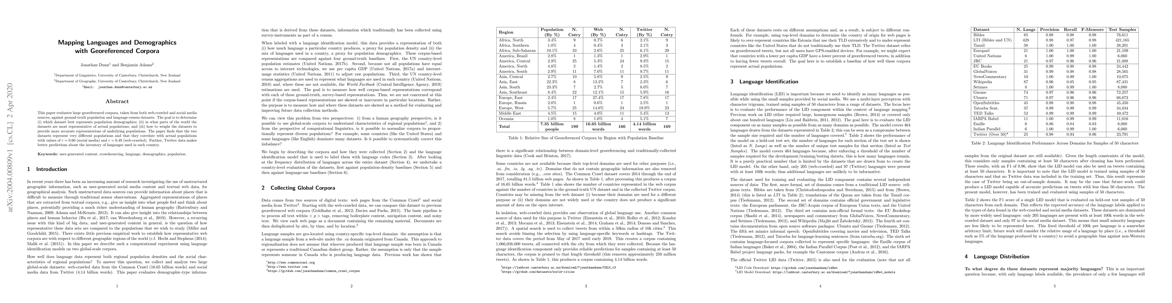 This paper evaluates large georeferenced corpora, taken from both web-crawled and social media sources, against ground-truth population and language-census datasets. The goal is to determine (i) which dataset best represents population demographics; (ii) in what parts of the world the datasets are most representative of actual populations; and (iii) how to weight the datasets to provide more accurate representations of underlying populations. The paper finds that the two datasets represent very different populations and that they correlate with actual populations with values of r=0.60 (social media) and r=0.49 (web-crawled). Further, Twitter data makes better predictions about the inventory of languages used in each country.