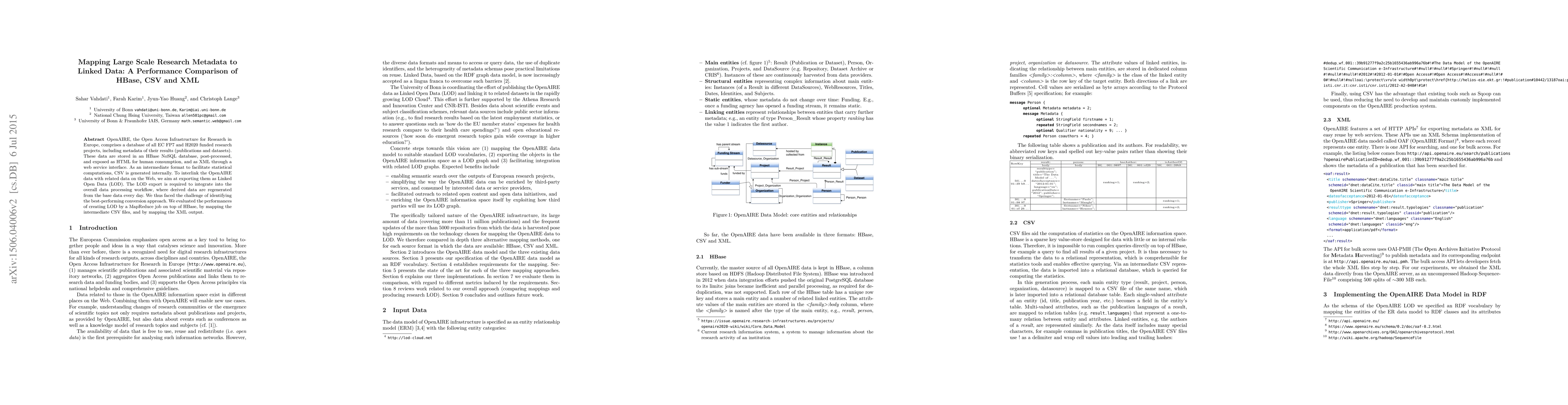This paper compares the performance of converting large-scale research metadata from HBase, CSV, and XML formats into Linked Open Data (LOD). The study aims to identify the most efficient method for integrating OpenAIRE data into a daily data processing workflow.