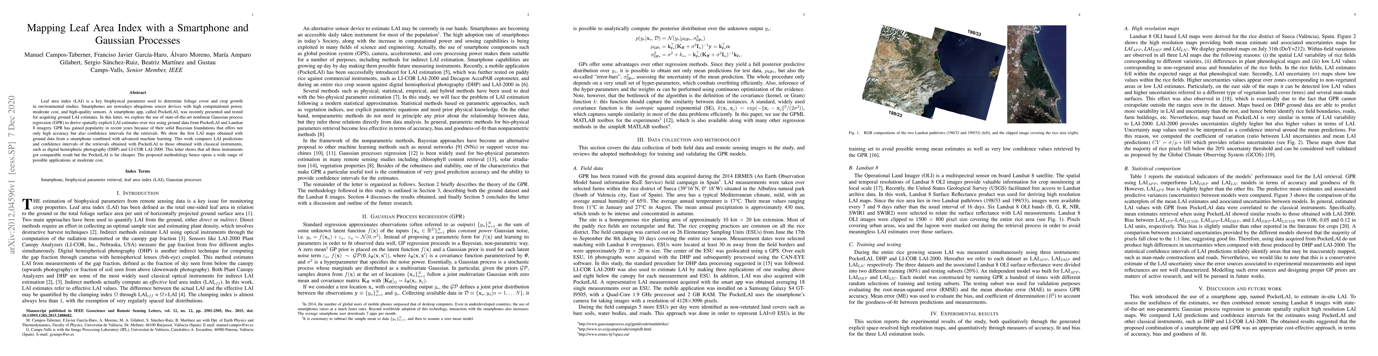 Leaf area index (LAI) is a key biophysical parameter used to determine foliage cover and crop growth in environmental studies. Smartphones are nowadays ubiquitous sensor devices with high computational power, moderate cost, and high-quality sensors. A smartphone app, called PocketLAI, was recently presented and tested for acquiring ground LAI estimates. In this letter, we explore the use of state-of-the-art nonlinear Gaussian process regression (GPR) to derive spatially explicit LAI estimates over rice using ground data from PocketLAI and Landsat 8 imagery. GPR has gained popularity in recent years because of their solid Bayesian foundations that offers not only high accuracy but also confidence intervals for the retrievals. We show the first LAI maps obtained with ground data from a smartphone combined with advanced machine learning. This work compares LAI predictions and confidence intervals of the retrievals obtained with PocketLAI to those obtained with classical instruments, such as digital hemispheric photography (DHP) and LI-COR LAI-2000. This letter shows that all three instruments got comparable result but the PocketLAI is far cheaper. The proposed methodology hence opens a wide range of possible applications at moderate cost.