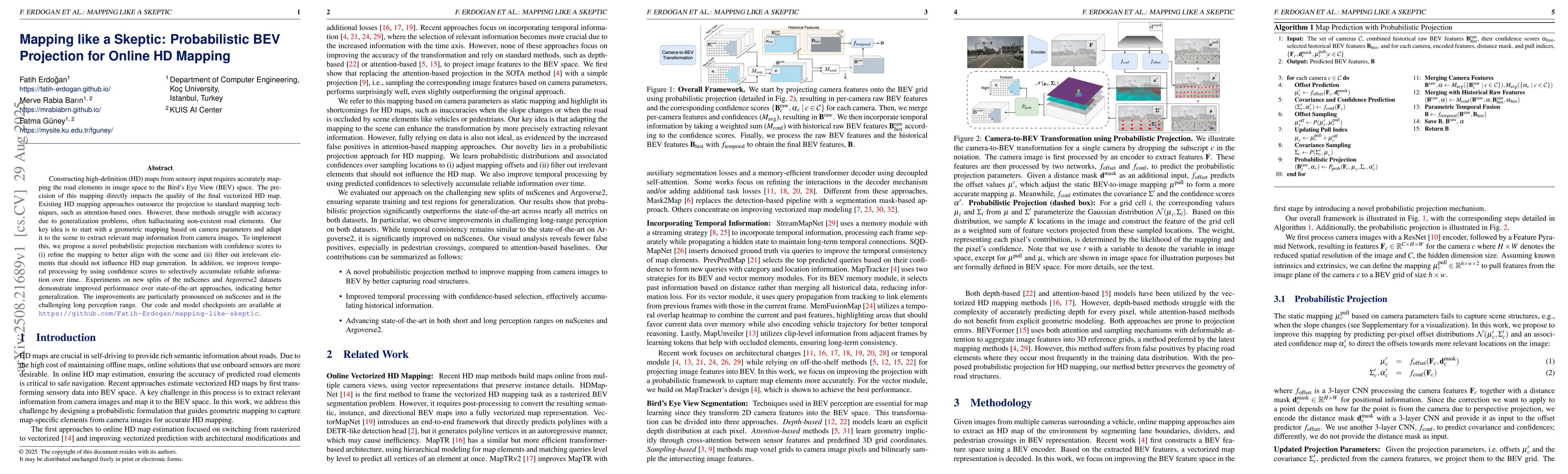 Constructing high-definition (HD) maps from sensory input requires accurately mapping the road elements in image space to the Bird's Eye View (BEV) space. The precision of this mapping directly impacts the quality of the final vectorized HD map. Existing HD mapping approaches outsource the projection to standard mapping techniques, such as attention-based ones. However, these methods struggle with accuracy due to generalization problems, often hallucinating non-existent road elements. Our key idea is to start with a geometric mapping based on camera parameters and adapt it to the scene to extract relevant map information from camera images. To implement this, we propose a novel probabilistic projection mechanism with confidence scores to (i) refine the mapping to better align with the scene and (ii) filter out irrelevant elements that should not influence HD map generation. In addition, we improve temporal processing by using confidence scores to selectively accumulate reliable information over time. Experiments on new splits of the nuScenes and Argoverse2 datasets demonstrate improved performance over state-of-the-art approaches, indicating better generalization. The improvements are particularly pronounced on nuScenes and in the challenging long perception range. Our code and model checkpoints are available at https://github.com/Fatih-Erdogan/mapping-like-skeptic .
