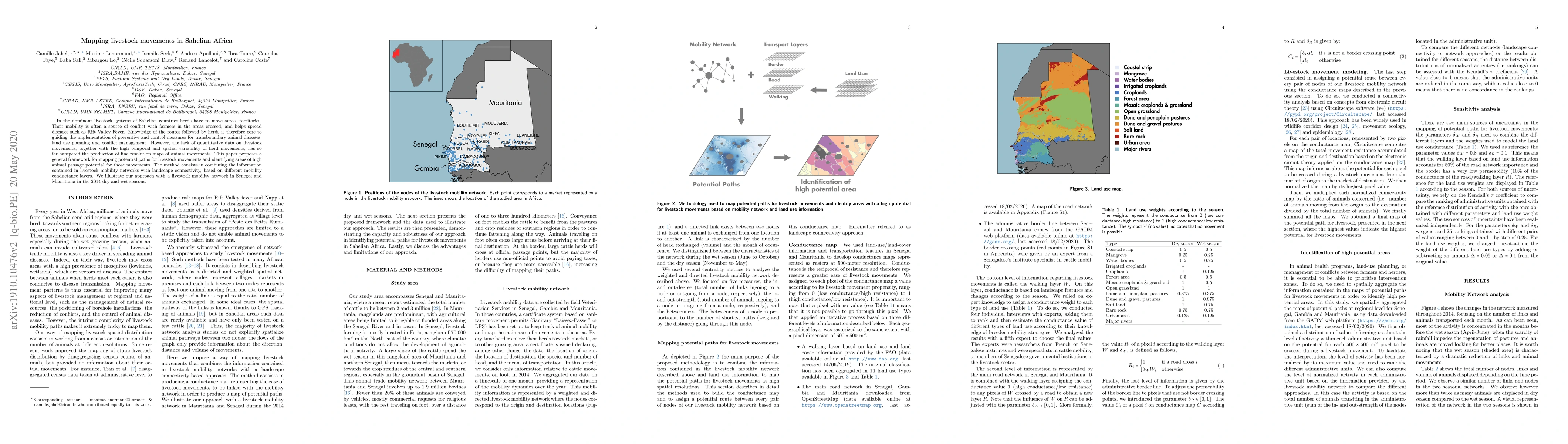 In the dominant livestock systems of Sahelian countries herds have to move across territories. Their mobility is often a source of conflict with farmers in the areas crossed, and helps spread diseases such as Rift Valley Fever. Knowledge of the routes followed by herds is therefore core to guiding the implementation of preventive and control measures for transboundary animal diseases, land use planning and conflict management. However, the lack of quantitative data on livestock movements, together with the high temporal and spatial variability of herd movements, has so far hampered the production of fine resolution maps of animal movements. This paper proposes a general framework for mapping potential paths for livestock movements and identifying areas of high animal passage potential for those movements. The method consists in combining the information contained in livestock mobility networks with landscape connectivity, based on different mobility conductance layers. We illustrate our approach with a livestock mobility network in Senegal and Mauritania in the 2014 dry and wet seasons.