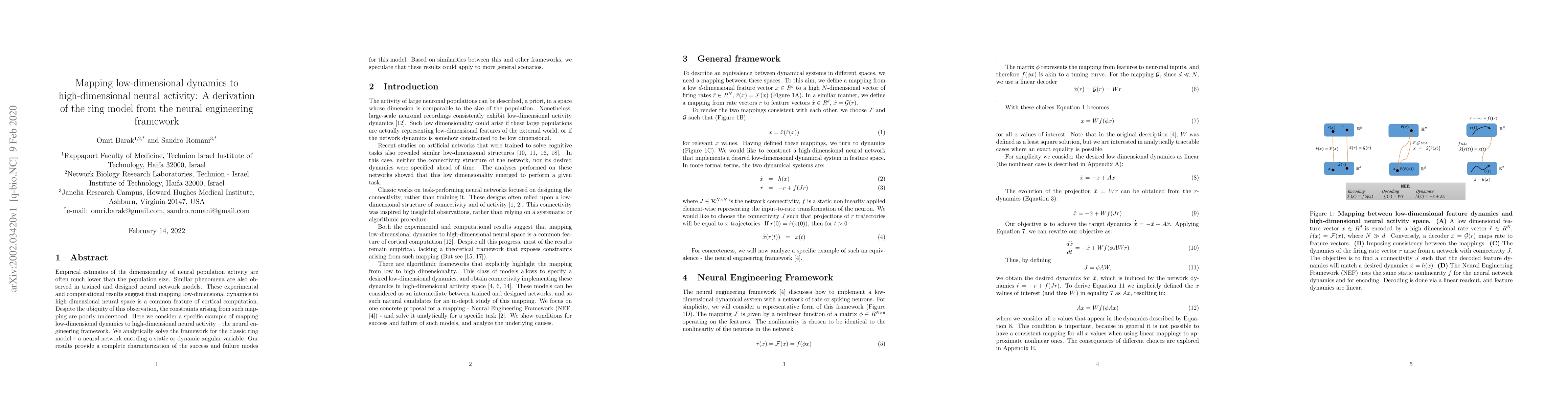 Empirical estimates of the dimensionality of neural population activity are often much lower than the population size. Similar phenomena are also observed in trained and designed neural network models. These experimental and computational results suggest that mapping low-dimensional dynamics to high-dimensional neural space is a common feature of cortical computation. Despite the ubiquity of this observation, the constraints arising from such mapping are poorly understood. Here we consider a specific example of mapping low-dimensional dynamics to high-dimensional neural activity -- the neural engineering framework. We analytically solve the framework for the classic ring model -- a neural network encoding a static or dynamic angular variable. Our results provide a complete characterization of the success and failure modes for this model. Based on similarities between this and other frameworks, we speculate that these results could apply to more general scenarios.