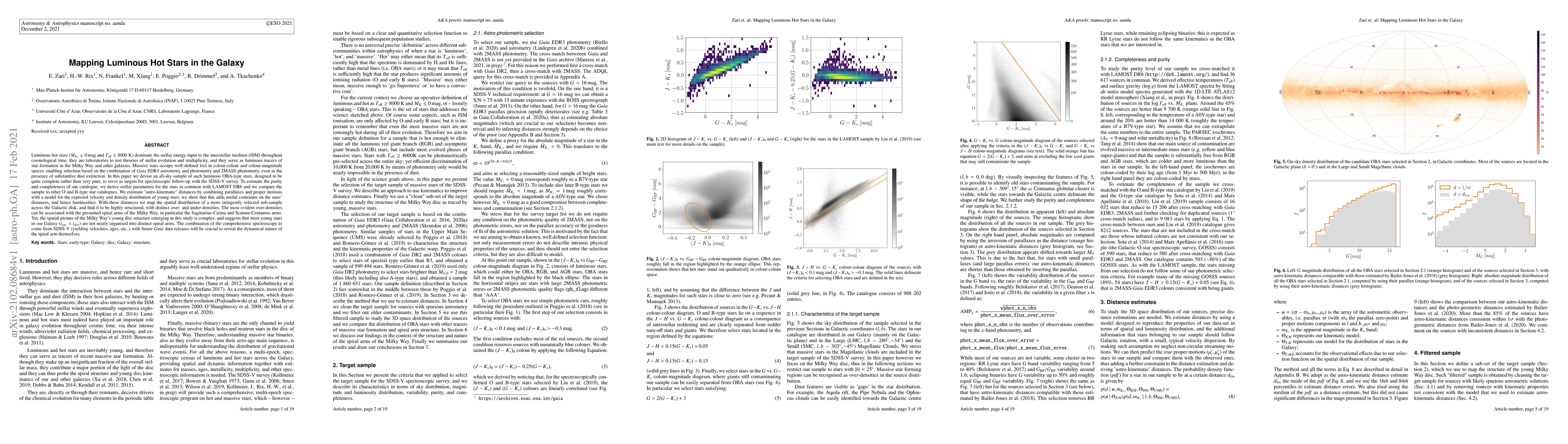 This paper creates an all-sky sample of luminous OBA-type stars, utilizing Gaia and 2MASS data, to study their spatial distribution in the Milky Way. The study reveals a complex, structured distribution with over-densities linked to spiral arms, suggesting that young stars are not strictly organized into distinct spiral structures.