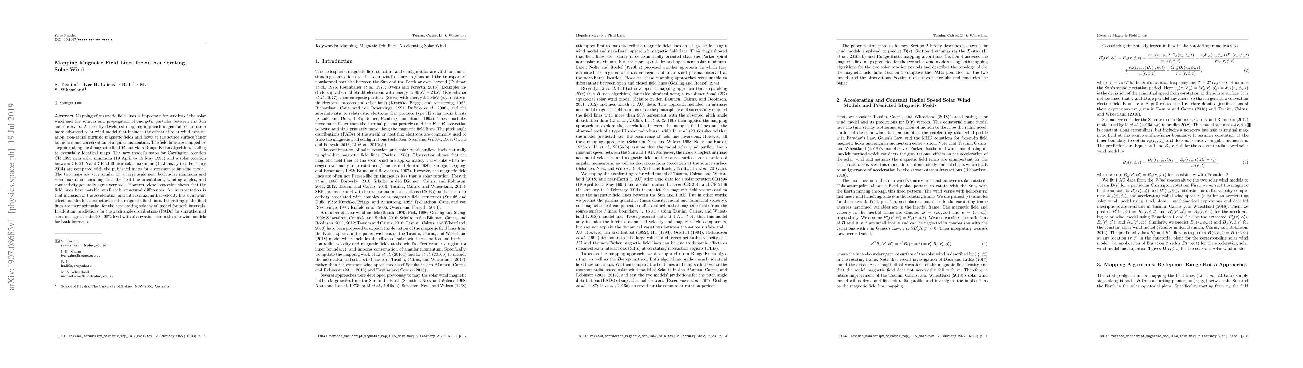 Mapping of magnetic field lines is important for studies of the solar wind and the sources and propagation of energetic particles between the Sun and observers. A recently developed mapping approach is generalised to use a more advanced solar wind model that includes the effects of solar wind acceleration, non-radial intrinsic magnetic fields and flows at the source surface/inner boundary, and conservation of angular momentum. The field lines are mapped by stepping along local magnetic field $\bm{B}$ and via a Runge-Kutta algorithm, leading to essentially identical maps. The new model's maps for Carrington rotation CR 1895 near solar minimum (19 April to 15 May 1995) and a solar rotation between CR 2145 and CR 2146 near solar maximum (14 January to 9 February 2014) are compared with the published maps for a constant solar wind model. The two maps are very similar on a large scale near both solar minimum and solar maximum, meaning that the field line orientations, winding angles, and connectivity generally agree very well. However, close inspection shows that the field lines have notable small-scale structural differences. An interpretation is that inclusion of the acceleration and intrinsic azimuthal velocity has significant effects on the local structure of the magnetic field lines. Interestingly, the field lines are more azimuthal for the accelerating solar wind model for both intervals. In addition, predictions for the pitch angle distributions (PADs) for suprathermal electrons agree at the $90$ -- $95\%$ level with observations for both solar wind models for both intervals.