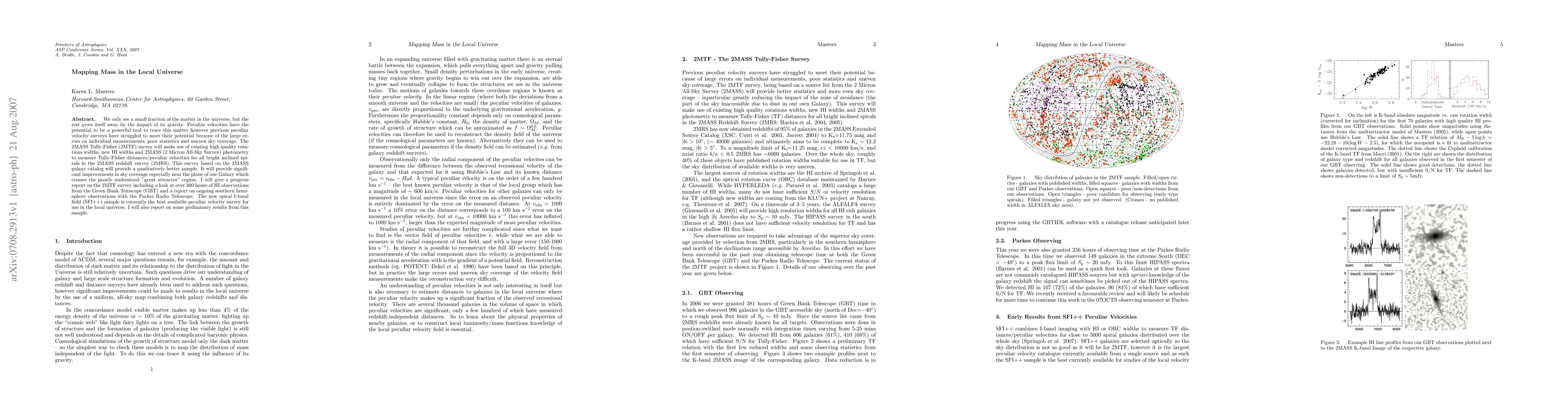 The 2MASS Tully-Fisher (2MTF) survey aims to map mass in the local universe by measuring peculiar velocities of bright inclined spirals using improved data from 2MASS, HI widths, and new observations. This survey promises enhanced sky coverage and better understanding of the "great attractor" region.