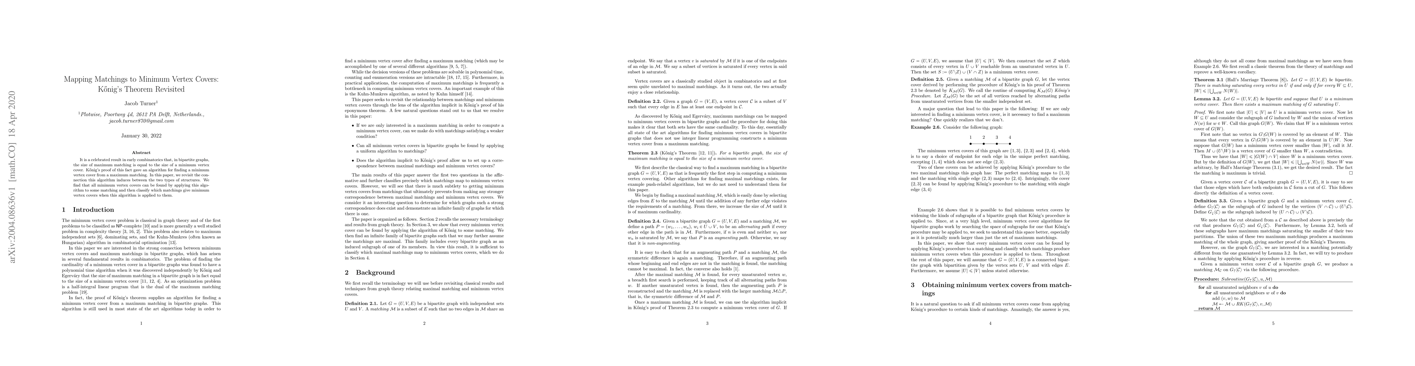 It is a celebrated result in early combinatorics that, in bipartite graphs, the size of maximum matching is equal to the size of a minimum vertex cover. K\H{o}nig's proof of this fact gave an algorithm for finding a minimum vertex cover from a maximum matching. In this paper, we revisit the connection this algorithm induces between the two types of structures. We find that all minimum vertex covers can be found by applying this algorithm to some matching and then classify which matchings give minimum vertex covers when this algorithm is applied to them.