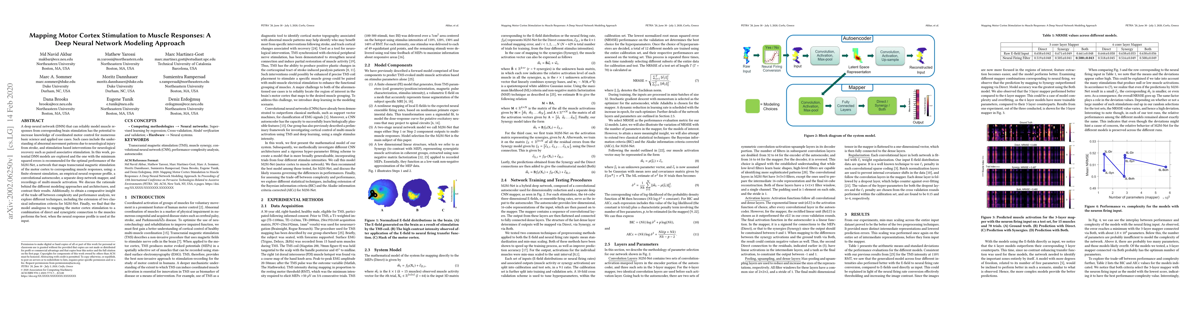 A deep neural network (DNN) that can reliably model muscle responses from corresponding brain stimulation has the potential to increase knowledge of coordinated motor control for numerous basic science and applied use cases. Such cases include the understanding of abnormal movement patterns due to neurological injury from stroke, and stimulation based interventions for neurological recovery such as paired associative stimulation. In this work, potential DNN models are explored and the one with the minimum squared errors is recommended for the optimal performance of the M2M-Net, a network that maps transcranial magnetic stimulation of the motor cortex to corresponding muscle responses, using: a finite element simulation, an empirical neural response profile, a convolutional autoencoder, a separate deep network mapper, and recordings of multi-muscle activation. We discuss the rationale behind the different modeling approaches and architectures, and contrast their results. Additionally, to obtain a comparative insight of the trade-off between complexity and performance analysis, we explore different techniques, including the extension of two classical information criteria for M2M-Net. Finally, we find that the model analogous to mapping the motor cortex stimulation to a combination of direct and synergistic connection to the muscles performs the best, when the neural response profile is used at the input.