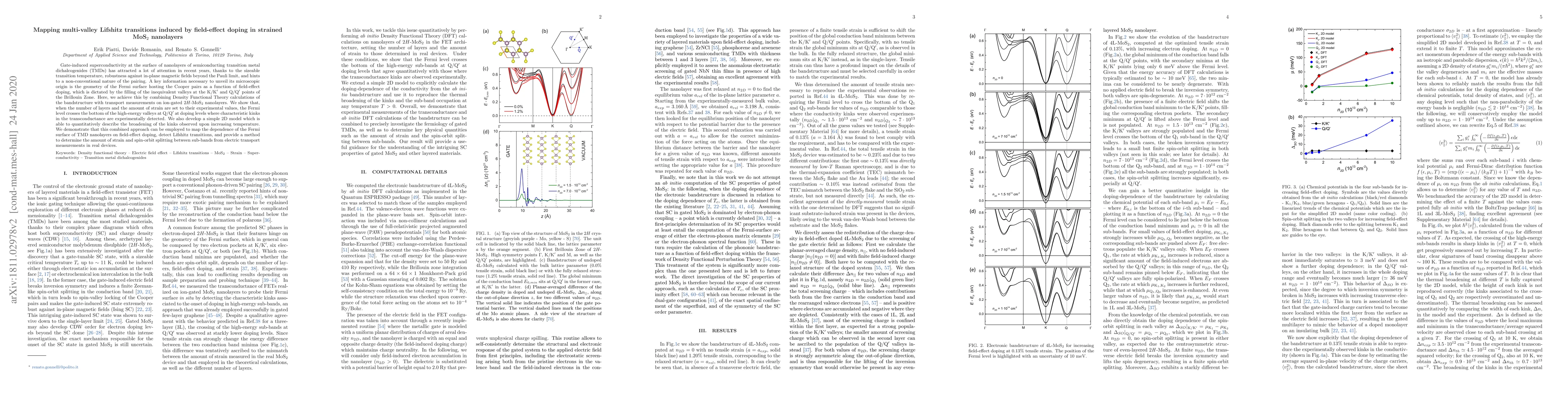 Gate-induced superconductivity at the surface of nanolayers of semiconducting transition metal dichalcogenides (TMDs) has attracted a lot of attention in recent years, thanks to the sizeable transition temperature, robustness against in-plane magnetic fields beyond the Pauli limit, and hints to a non-conventional nature of the pairing. A key information necessary to unveil its microscopic origin is the geometry of the Fermi surface hosting the Cooper pairs as a function of field-effect doping, which is dictated by the filling of the inequivalent valleys at the K/K$^{\prime}$ and Q/Q$^{\prime}$ points of the Brillouin Zone. Here, we achieve this by combining Density Functional Theory calculations of the bandstructure with transport measurements on ion-gated 2H-MoS$_{2}$ nanolayers. We show that, when the number of layers and the amount of strain are set to their experimental values, the Fermi level crosses the bottom of the high-energy valleys at Q/Q$^{\prime}$ at doping levels where characteristic kinks in the transconductance are experimentally detected. We also develop a simple 2D model which is able to quantitatively describe the broadening of the kinks observed upon increasing temperature. We demonstrate that this combined approach can be employed to map the dependence of the Fermi surface of TMD nanolayers on field-effect doping, detect Lifshitz transitions, and provide a method to determine the amount of strain and spin-orbit splitting between sub-bands from electric transport measurements in real devices.