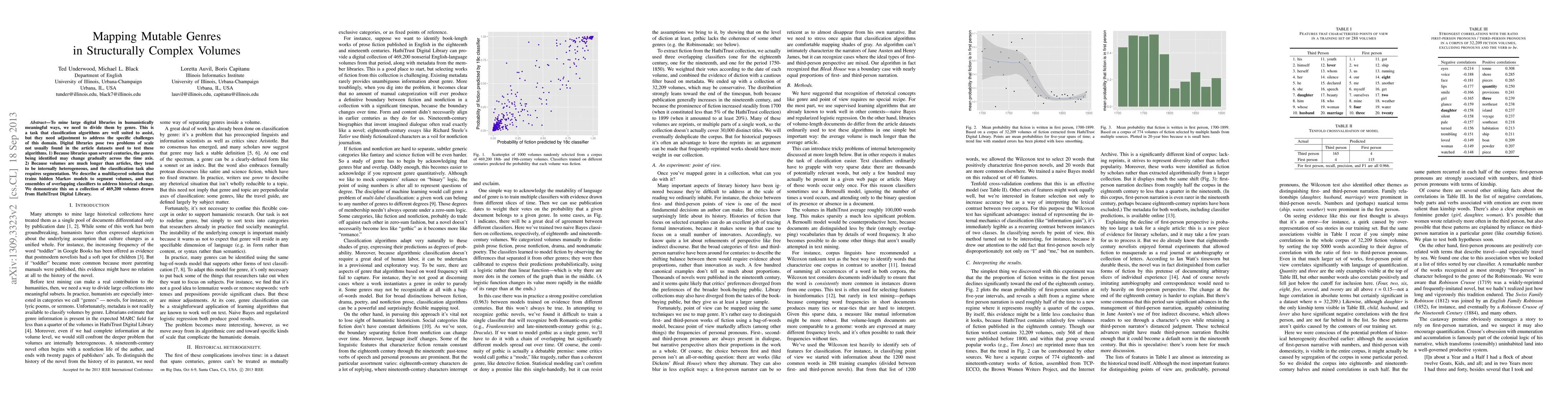 To mine large digital libraries in humanistically meaningful ways, scholars need to divide them by genre. This is a task that classification algorithms are well suited to assist, but they need adjustment to address the specific challenges of this domain. Digital libraries pose two problems of scale not usually found in the article datasets used to test these algorithms. 1) Because libraries span several centuries, the genres being identified may change gradually across the time axis. 2) Because volumes are much longer than articles, they tend to be internally heterogeneous, and the classification task needs to begin with segmentation. We describe a multi-layered solution that trains hidden Markov models to segment volumes, and uses ensembles of overlapping classifiers to address historical change. We test this approach on a collection of 469,200 volumes drawn from HathiTrust Digital Library. To demonstrate the humanistic value of these methods, we extract 32,209 volumes of fiction from the digital library, and trace the changing proportions of first- and third-person narration in the corpus. We note that narrative points of view seem to have strong associations with particular themes and genres.