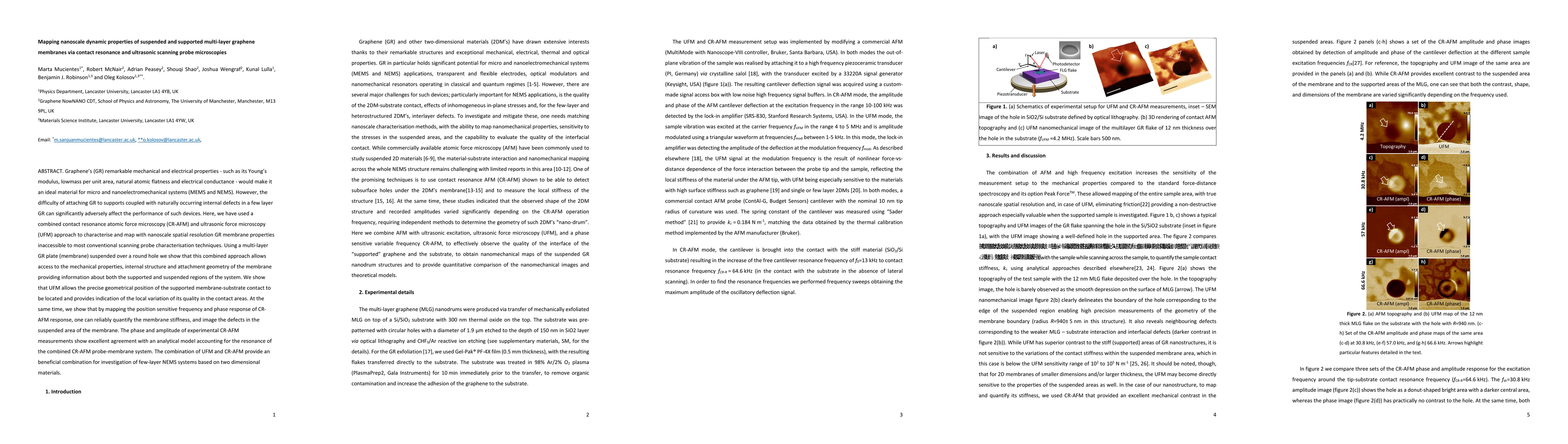 Graphene (GR) remarkable mechanical and electrical properties - such as its Young's modulus, low mass per unit area, natural atomic flatness and electrical conductance - would make it an ideal material for micro and nanoelectromechanical systems (MEMS and NEMS). However, the difficulty of attaching GR to supports coupled with naturally occurring internal defects in a few-layer GR can significantly adversely affect the performance of such devices. Here, we have used a combined contact resonance atomic force microscopy (CR-AFM) and ultrasonic force microscopy (UFM) approach to characterise and map with nanoscale spatial resolution GR membrane properties inaccessible to most conventional scanning probe characterisation techniques. Using a multi-layer GR plate (membrane) suspended over a round hole we show that this combined approach allows access to the mechanical properties, internal structure and attachment geometry of the membrane providing information about both the supported and suspended regions of the system. We show that UFM allows the precise geometrical position of the supported membrane-substrate contact to be located and provides indication of the local variation of its quality in the contact areas. At the same time, we show that by mapping the position sensitive frequency and phase response of CR-AFM response, one can reliably quantify the membrane stiffness, and image the defects in the suspended area of the membrane. The phase and amplitude of experimental CR-AFM measurements show excellent agreement with an analytical model accounting for the resonance of the combined CR-AFM probe-membrane system. The combination of UFM and CR-AFM provide a beneficial combination for investigation of few-layer NEMS systems based on two dimensional materials.