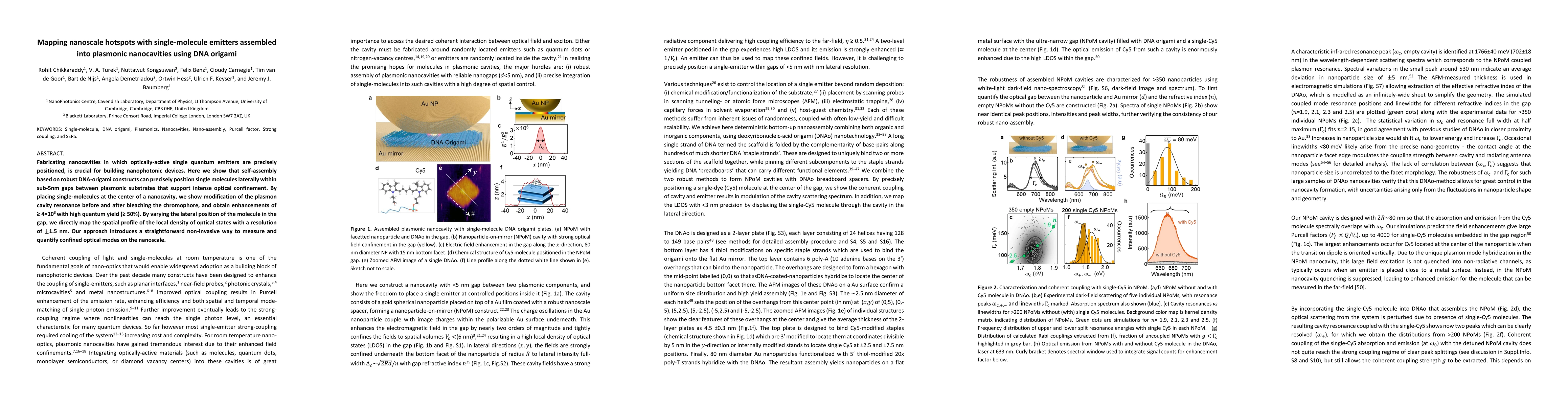 This paper demonstrates the precise positioning of single-molecule emitters within sub-5nm gaps using DNA origami to create plasmonic nanocavities, achieving optical enhancements of $\geq4\times10^3$ and mapping the spatial profile of local density of optical states with $\pm1.5$ nm resolution. This method provides a non-invasive approach to measuring confined optical modes at the nanoscale.