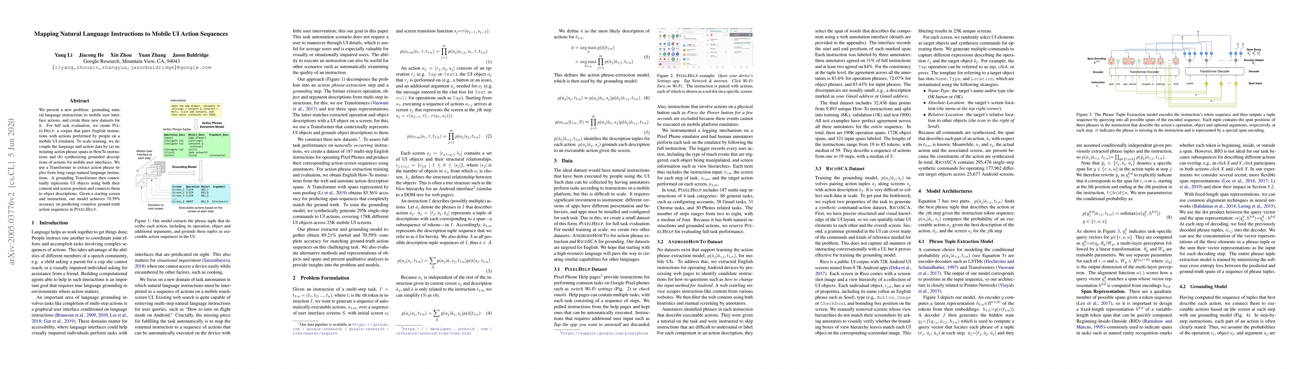 This paper introduces a method to map natural language instructions to mobile UI action sequences, creating three new datasets, including PIXELHELP, which pairs English instructions with corresponding UI actions. The model uses a Transformer to extract and ground UI objects, achieving 70.59% accuracy in predicting action sequences.