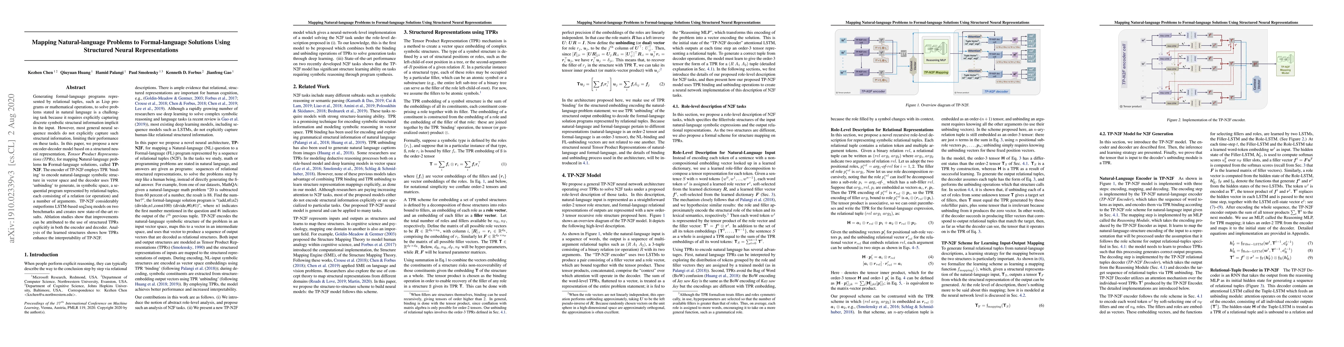 This paper proposes TP-N2F, an encoder-decoder model using Tensor Product Representations (TPRs) to map natural-language problems to formal-language solutions. TP-N2F outperforms LSTM-based models by explicitly capturing symbolic structural information, leading to state-of-the-art results and enhanced interpretability.