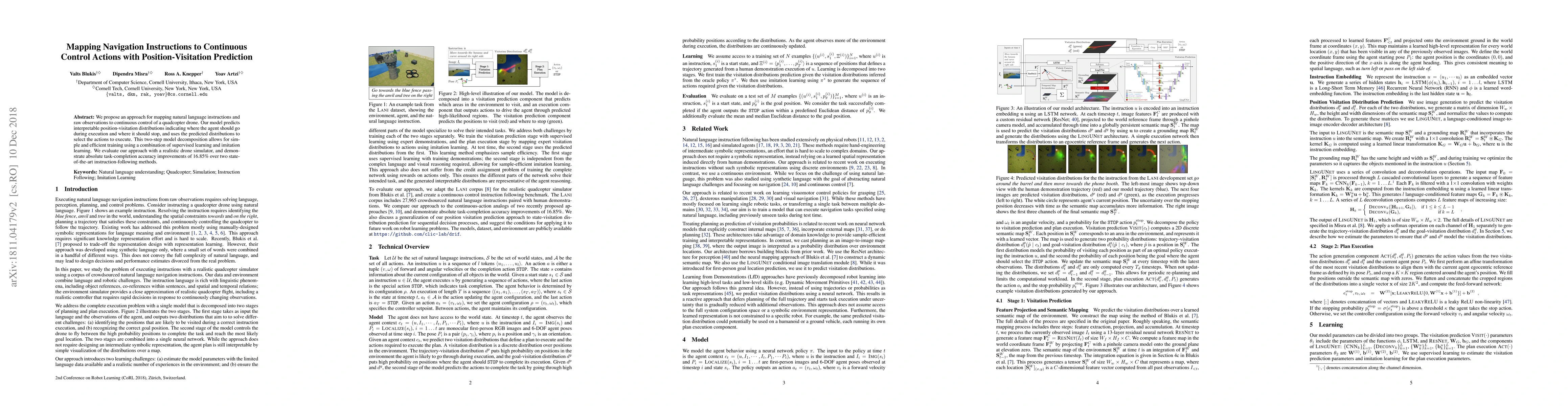 We propose an approach for mapping natural language instructions and raw observations to continuous control of a quadcopter drone. Our model predicts interpretable position-visitation distributions indicating where the agent should go during execution and where it should stop, and uses the predicted distributions to select the actions to execute. This two-step model decomposition allows for simple and efficient training using a combination of supervised learning and imitation learning. We evaluate our approach with a realistic drone simulator, and demonstrate absolute task-completion accuracy improvements of 16.85% over two state-of-the-art instruction-following methods.