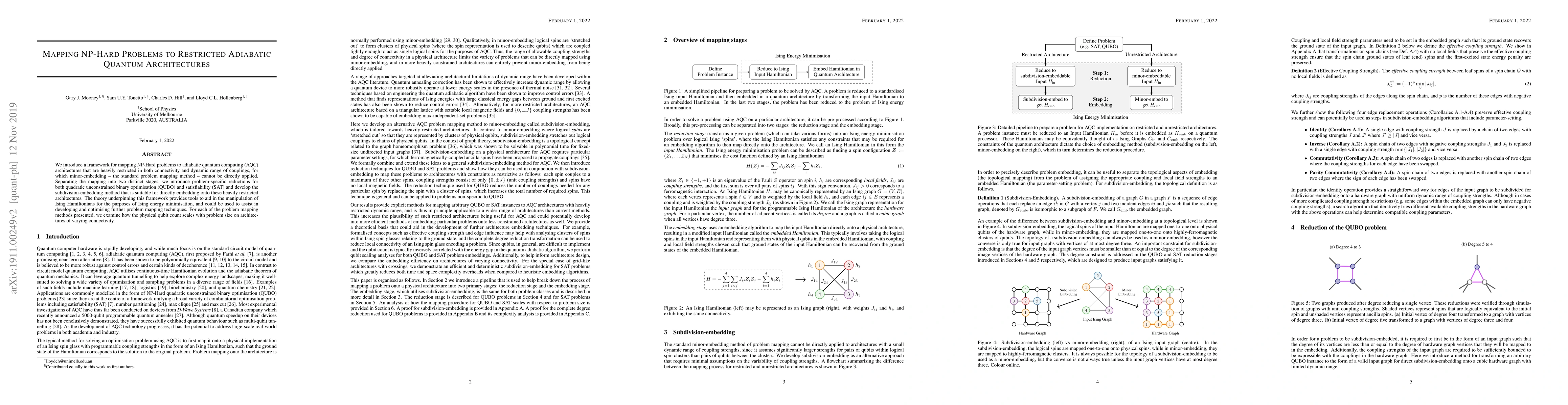 This paper presents a novel framework for mapping NP-Hard problems to restricted adiabatic quantum computing architectures, introducing subdivision-embedding methods for QUBO and SAT problems. It explores how physical qubit count scales with problem size across different architectures.