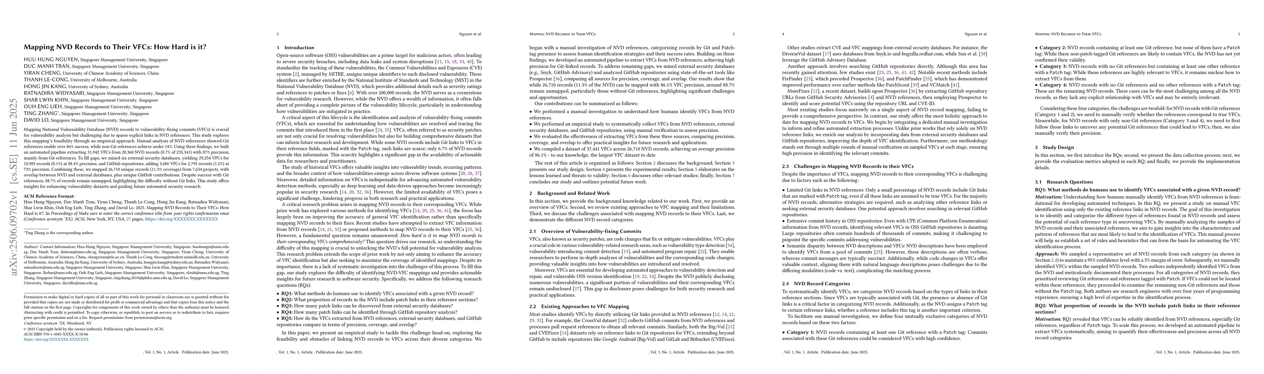 Researchers developed an automated pipeline to map National Vulnerability Database records to vulnerability-fixing commits with 87% precision, highlighting the challenge of doing so without explicit links.