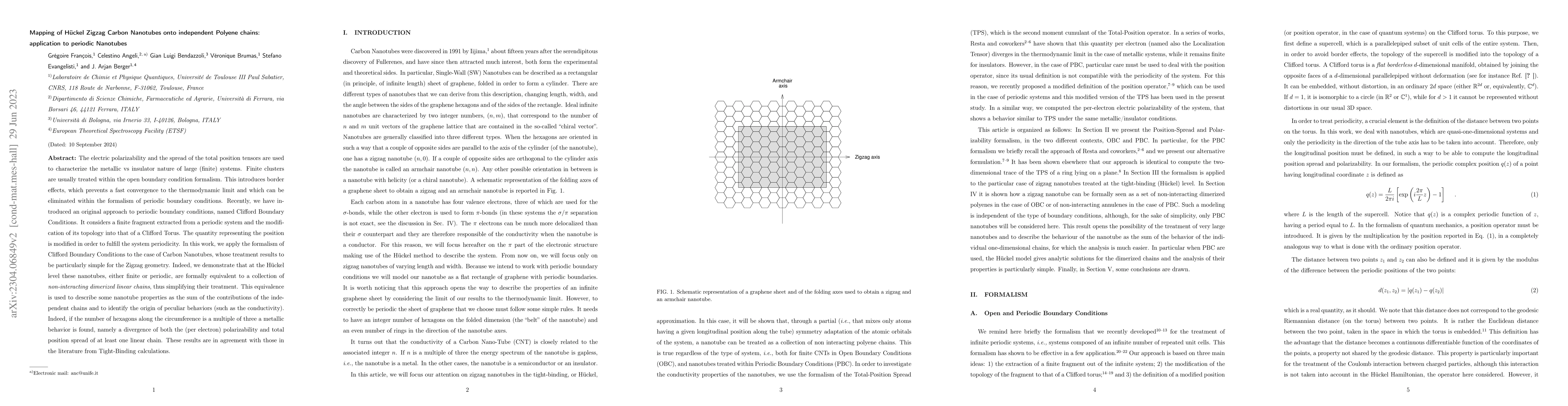 This paper applies Clifford Boundary Conditions to map Hückel Zigzag Carbon Nanotubes onto independent polyene chains, demonstrating their metallic or insulating nature based on polarizability and position tensors. It shows that these nanotubes are equivalent to non-interacting dimerized linear chains, simplifying their analysis and predicting metallic behavior when the number of hexagons along the circumference is a multiple of three.