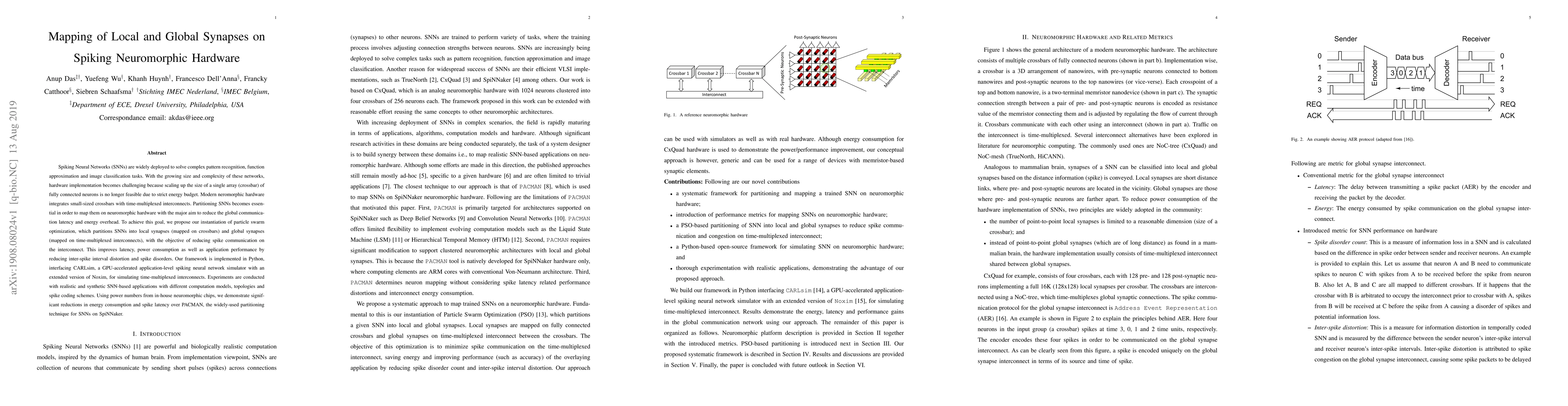 This paper proposes a particle swarm optimization technique to partition Spiking Neural Networks into local and global synapses for efficient mapping on spiking neuromorphic hardware. The method aims to reduce global communication latency and energy overhead, improving performance by minimizing inter-spike interval distortion and spike disorders, demonstrated with significant reductions in energy consumption and spike latency compared to PACMAN.