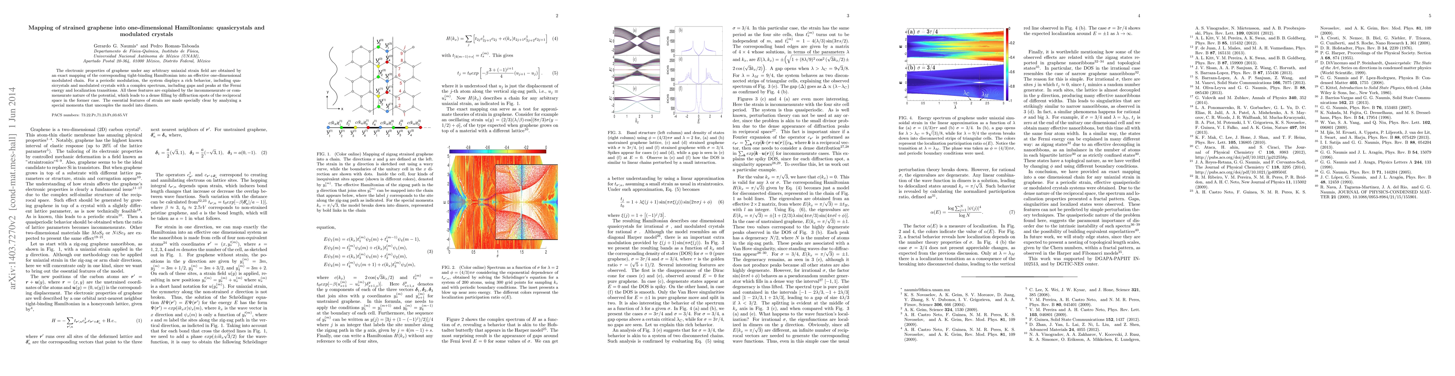 The electronic properties of graphene under any arbitrary uniaxial strain field are obtained by an exact mapping of the corresponding tight-binding Hamiltonian into an effective one-dimensional modulated chain. For a periodic modulation, the system displays a rich behavior, including quasicrystals and modulated crystals with a complex spectrum, gaps at the Fermi energy and interesting localization properties. These features are explained by the incommensurate or commensurate nature of the potential, which leads to a dense filling of the reciprocal space in the former case. Thus, the usual perturbation theory approach breaks down in some cases, as is proved by analyzing a special momentum that uncouples the model into dimers.