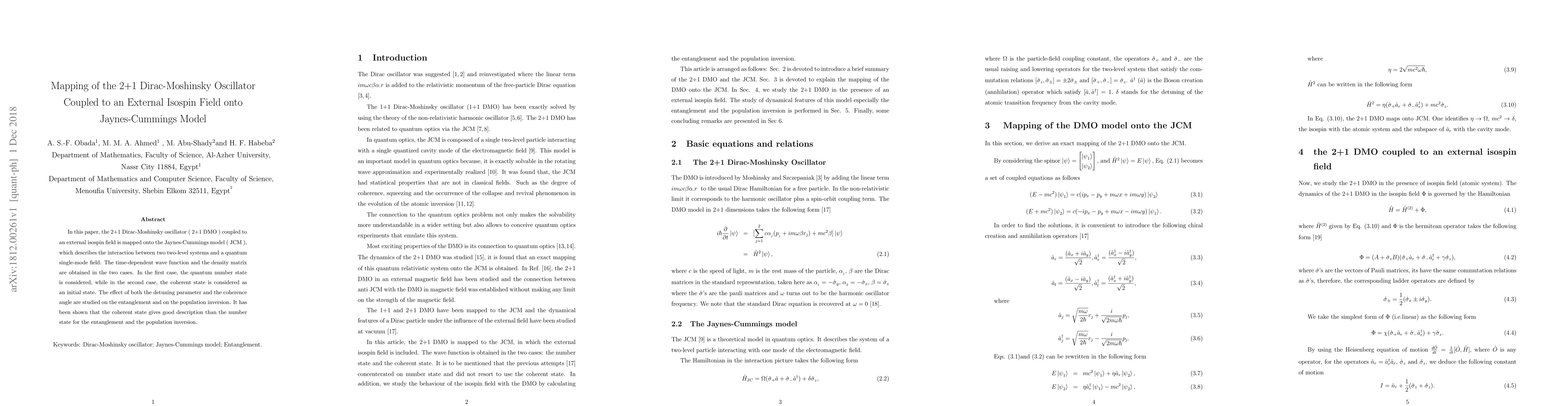 In this paper, the 2+1 Dirac-Moshinsky oscillator (2+1 DMO) coupled to an external isospin field is mapped onto the Jaynes-Cummings model (JCM), which describes the interaction between two two-level systems and a quantum single-mode field. The time-dependent wave function and the density matrix are obtained in the two cases. In the first case, the quantum number state is considered, while in the second case, the coherent state is considered as an initial state. The effect of both the detuning parameter and the coherence angle are studied on the entanglement and on the population inversion. It has been shown that the coherent state gives good description than the number state for the entanglement and the population inversion.