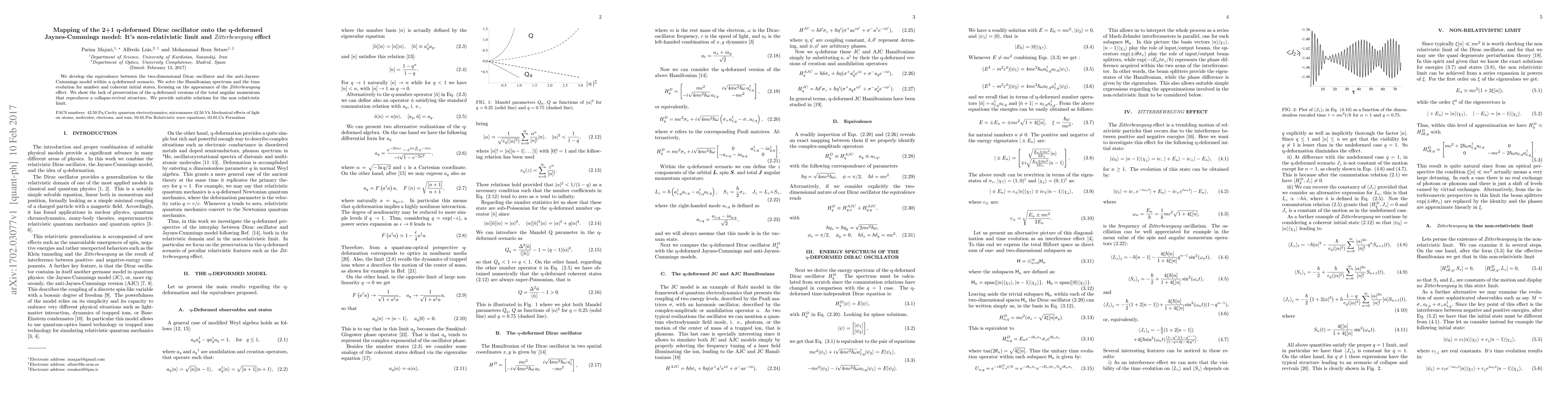 This paper establishes an equivalence between the 2+1 q-deformed Dirac oscillator and the q-deformed Jaynes-Cummings model, exploring the Hamiltonian spectrum and time evolution. It highlights the Zitterbewegung effect and the absence of total angular momentum preservation, providing relations for the non-relativistic limit.