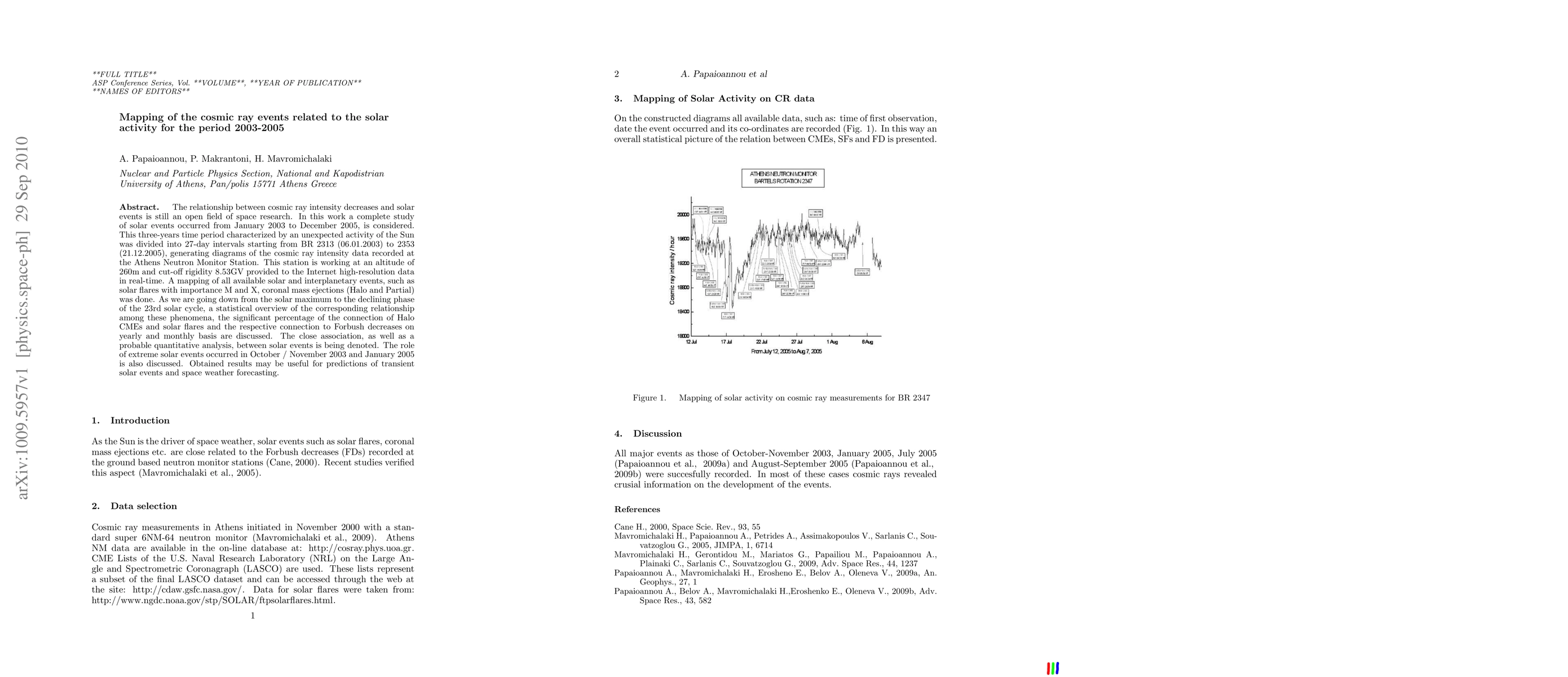 The relationship between cosmic ray intensity decreases and solar events is still an open field of space research. In this work a complete study of solar events occurred from January 2003 to December 2005, is considered. This three-years time period characterized by an unexpected activity of the Sun was divided into 27-day intervals starting from BR 2313 (06.01.2003) to 2353 (21.12.2005), generating diagrams of the cosmic ray intensity data recorded at the Athens Neutron Monitor Station. This station is working at an altitude of 260m and cut-off rigidity 8.53GV provided to the Internet high-resolution data in real-time. A mapping of all available solar and interplanetary events, such as solar flares with importance M and X, coronal mass ejections (Halo and Partial) was done. As we are going down from the solar maximum to the declining phase of the 23rd solar cycle, a statistical overview of the corresponding relationship among these phenomena, the significant percentage of the connection of Halo CMEs and solar flares and the respective connection to Forbush decreases on yearly and monthly basis are discussed. The close association, as well as a probable quantitative analysis, between solar events is being denoted. The role of extreme solar events occurred in October / November 2003 and January 2005 is also discussed. Obtained results may be useful for predictions of transient solar events and space weather forecasting.
