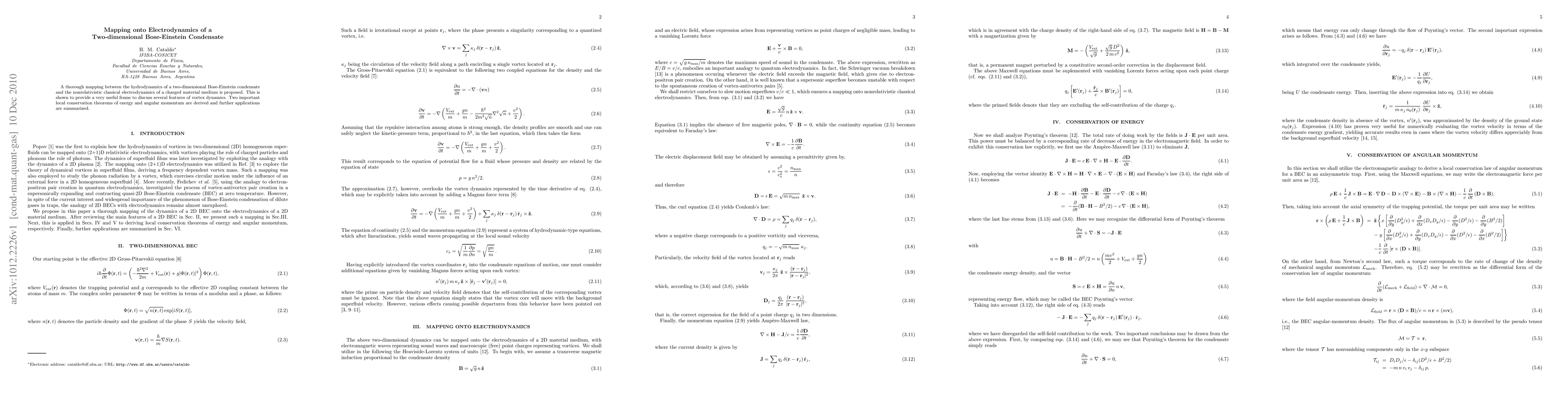 The paper proposes a mapping between the hydrodynamics of a two-dimensional Bose-Einstein condensate and classical electrodynamics, offering insights into vortex dynamics. It derives local conservation theorems for energy and angular momentum, with potential for further applications.