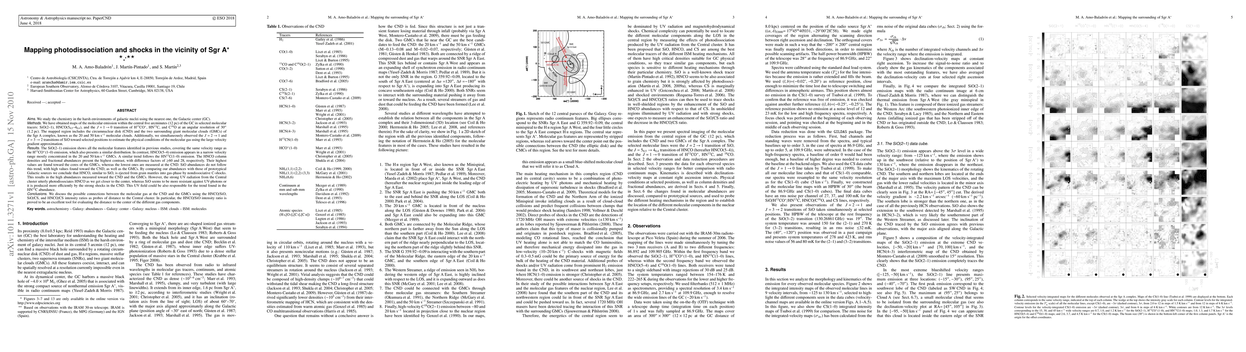 We have obtained maps of the molecular emission within the central five arcminutes (12 pc) of the Galactic center (GC) in selected molecular tracers: SiO(2-1), HNCO(5_{0,5}-4_{0,4}), and the J=1-->0 transition of H^{13}CO+, HN^{13}C, and C^{18}O at an angular resolution of 30" (1.2 pc). The mapped region includes the circumnuclear disk (CND) and the two surrounding giant molecular clouds (GMCs) of the Sgr A complex, known as the 20 and 50 km s^{-1} molecular clouds.Additionally, we simultaneously observed the J=2-1 and 3-2 transitions of SiO toward selected positions to estimate the physical conditions of the molecular gas. The SiO(2-1) and H^{13}CO+(1-0) emission covers the same velocity range and presents a similar distribution. In contrast, HNCO(5-4) emission appears in a narrow velocity range mostly concentrated in the 20 and 50 km s^{-1} GMCs. The HNCO column densities and fractional abundances present the highest contrast, with difference factors of $\geq$60 and 28, respectively. Their highest values are found toward the cores of the GMCs, whereas the lowest ones are measured at the CND. SiO abundances do not follow this trend, with high values found toward the CND, as well as the GMCs. By comparing our abundances with those of prototypical Galactic sources we conclude that HNCO, similar to SiO, is ejected from grain mantles into gas-phase by nondissociative C-shocks. This results in the high abundances measured toward the CND and the GMCs. However, the strong UV radiation from the Central cluster utterly photodissociates HNCO as we get closer to the center, whereas SiO seems to be more resistant against UV-photons or it is produced more efficiently by the strong shocks in the CND. Finally, we discuss the possible connections between the molecular gas at the CND and the GMCs using the HNCO/SiO, SiO/CS, and HNCO/CS intensity ratios as probes of distance to the Central cluster.