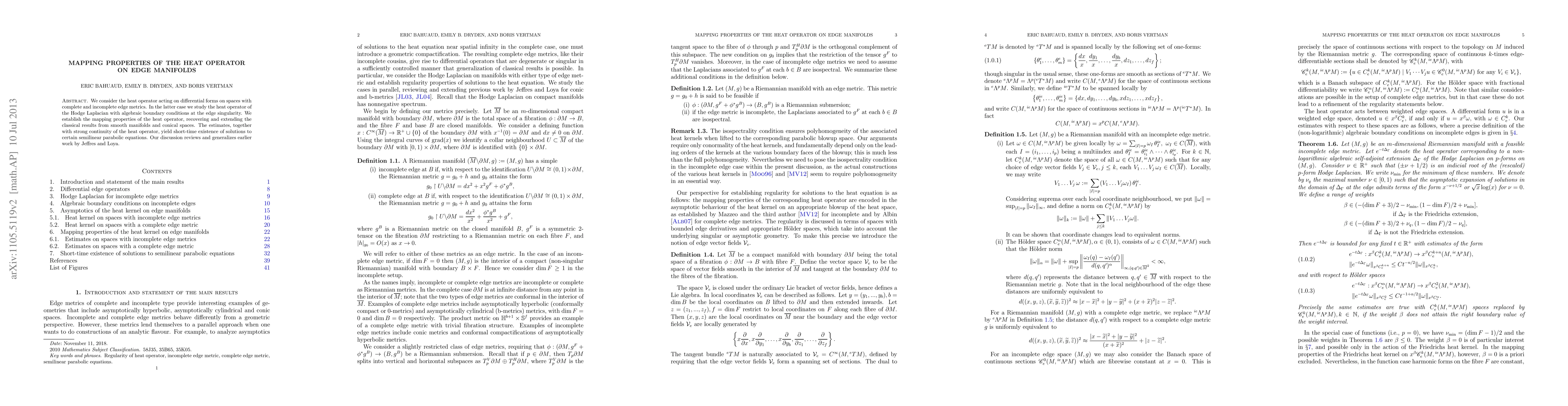 We consider the heat operator acting on differential forms on spaces with complete and incomplete edge metrics. In the latter case we study the heat operator of the Hodge Laplacian with algebraic boundary conditions at the edge singularity. We establish the mapping properties of the heat operator, recovering and extending the classical results from smooth manifolds and conical spaces. The estimates, together with strong continuity of the heat operator, yield short-time existence of solutions to certain semilinear parabolic equations. Our discussion reviews and generalizes earlier work by Jeffres and Loya.