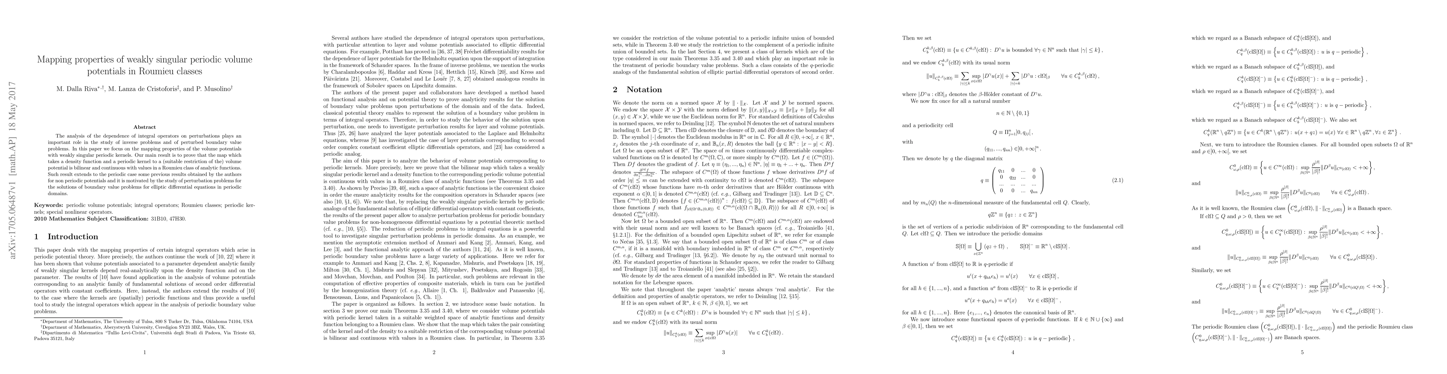 The analysis of the dependence of integral operators on perturbations plays an important role in the study of inverse problems and of perturbed boundary value problems. In this paper we focus on the mapping properties of the volume potentials with weakly singular periodic kernels. Our main result is to prove that the map which takes a density function and a periodic kernel to a (suitable restriction of the) volume potential is bilinear and continuous with values in a Roumieu class of analytic functions. Such result extends to the periodic case some previous results obtained by the authors for non periodic potentials and it is motivated by the study of perturbation problems for the solutions of boundary value problems for elliptic differential equations in periodic domains.