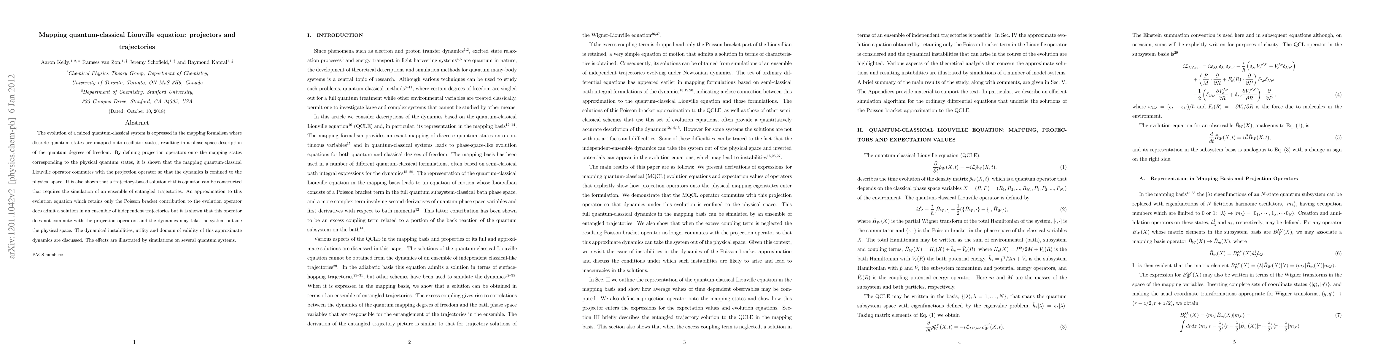 The evolution of a mixed quantum-classical system is expressed in the mapping formalism where discrete quantum states are mapped onto oscillator states, resulting in a phase space description of the quantum degrees of freedom. By defining projection operators onto the mapping states corresponding to the physical quantum states, it is shown that the mapping quantum-classical Liouville operator commutes with the projection operator so that the dynamics is confined to the physical space. It is also shown that a trajectory-based solution of this equation can be constructed that requires the simulation of an ensemble of entangled trajectories. An approximation to this evolution equation which retains only the Poisson bracket contribution to the evolution operator does admit a solution in an ensemble of independent trajectories but it is shown that this operator does not commute with the projection operators and the dynamics may take the system outside the physical space. The dynamical instabilities, utility and domain of validity of this approximate dynamics are discussed. The effects are illustrated by simulations on several quantum systems.