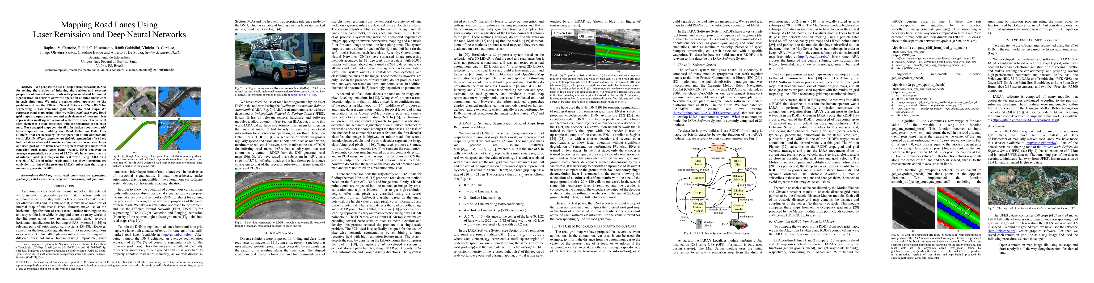 This paper presents a method using deep neural networks, specifically Efficient Neural Networks (ENet), to segment LiDAR remission grid maps into road maps for autonomous vehicle navigation in urban areas without clear lane markings. Trained on a dataset of manually marked road lanes, ENet achieved an 83.7% segmentation accuracy. Real-world testing with the autonomous car IARA on a 3.7 km stretch showed performance comparable to manually generated road maps.