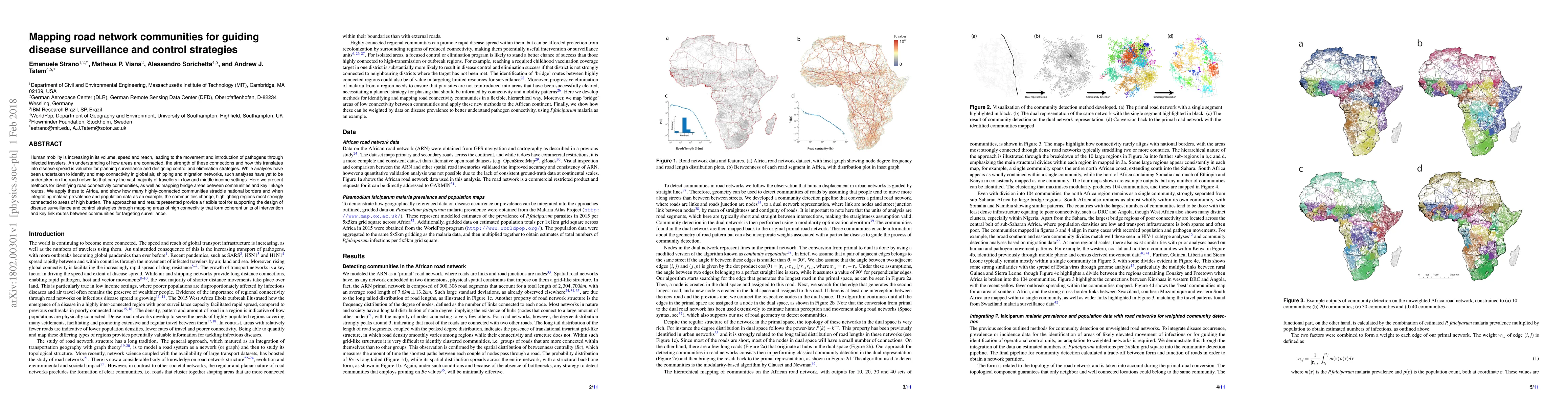 Human mobility is increasing in its volume, speed and reach, leading to the movement and introduction of pathogens through infected travelers. An understanding of how areas are connected, the strength of these connections and how this translates into disease spread is valuable for planning surveillance and designing control and elimination strategies. While analyses have been undertaken to identify and map connectivity in global air, shipping and migration networks, such analyses have yet to be undertaken on the road networks that carry the vast majority of travellers in low and middle income settings. Here we present methods for identifying road connectivity communities, as well as mapping bridge areas between communities and key linkage routes. We apply these to Africa, and show how many highly-connected communities straddle national borders and when integrating malaria prevalence and population data as an example, the communities change, highlighting regions most strongly connected to areas of high burden. The approaches and results presented provide a flexible tool for supporting the design of disease surveillance and control strategies through mapping areas of high connectivity that form coherent units of intervention and key link routes between communities for targeting surveillance.