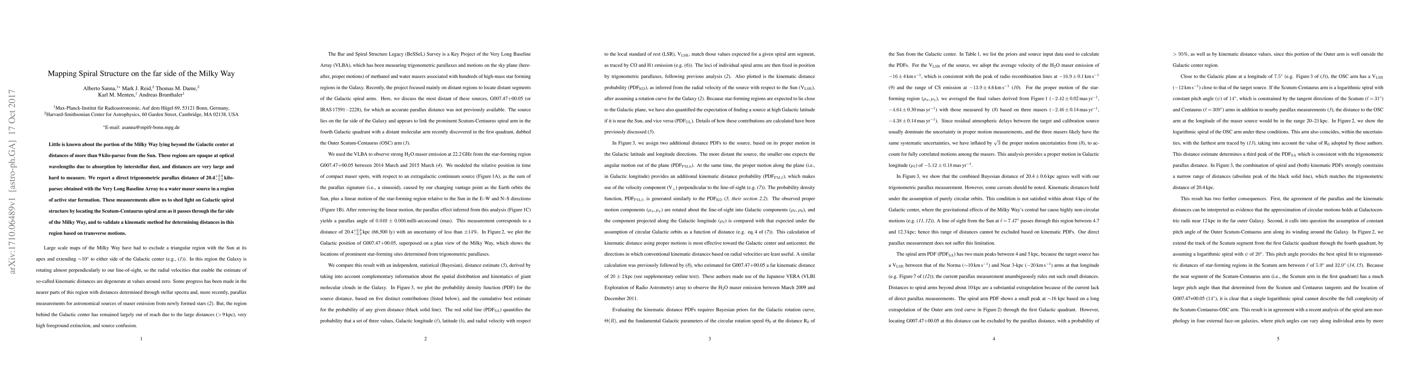 This paper reports a trigonometric parallax distance of 20.4 kpc to a water maser source, enabling the identification of the Scutum-Centaurus spiral arm on the far side of the Milky Way and validating a kinematic method for distance determination in this region.