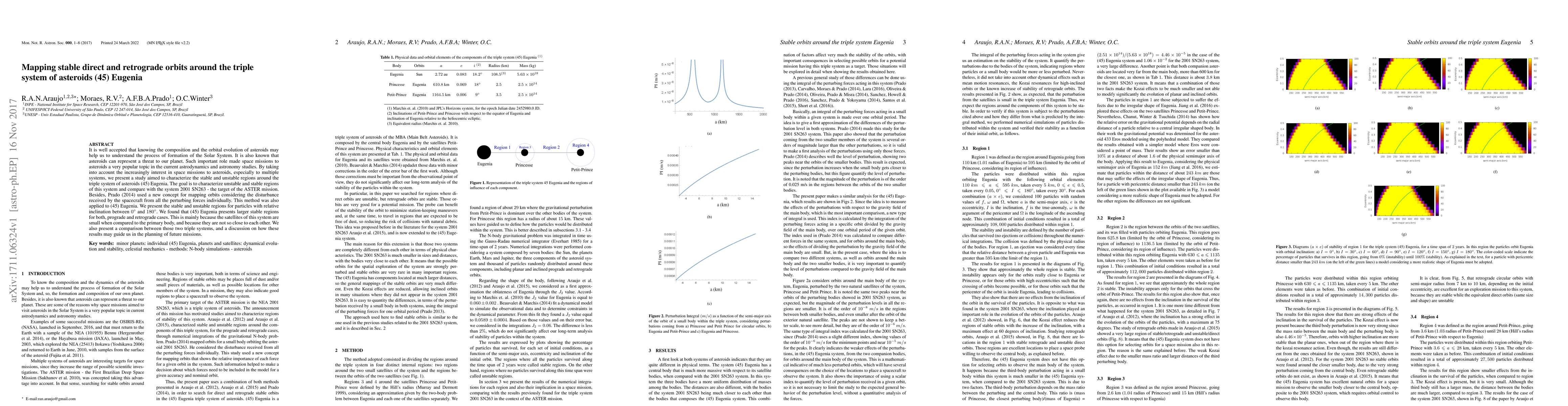 It is well accepted that knowing the composition and the orbital evolution of asteroids may help us to understand the process of formation of the Solar System. It is also known that asteroids can represent a threat to our planet. Such important role made space missions to asteroids a very popular topic in the current astrodynamics and astronomy studies. By taking into account the increasingly interest in space missions to asteroids, especially to multiple systems, we present a study aimed to characterize the stable and unstable regions around the triple system of asteroids (45) Eugenia. The goal is to characterize unstable and stable regions of this system and compare with the system 2001 SN263 - the target of the ASTER mission. Besides, Prado (2014) used a new concept for mapping orbits considering the disturbance received by the spacecraft from all the perturbing forces individually. This method was also applied to (45) Eugenia. We present the stable and unstable regions for particles with relative inclination between 0 and 180 degrees. We found that (45) Eugenia presents larger stable regions for both, prograde and retrograde cases. This is mainly because the satellites of this system are small when compared to the primary body, and because they are not so close to each other. We also present a comparison between those two triple systems, and a discussion on how these results may guide us in the planning of future missions.