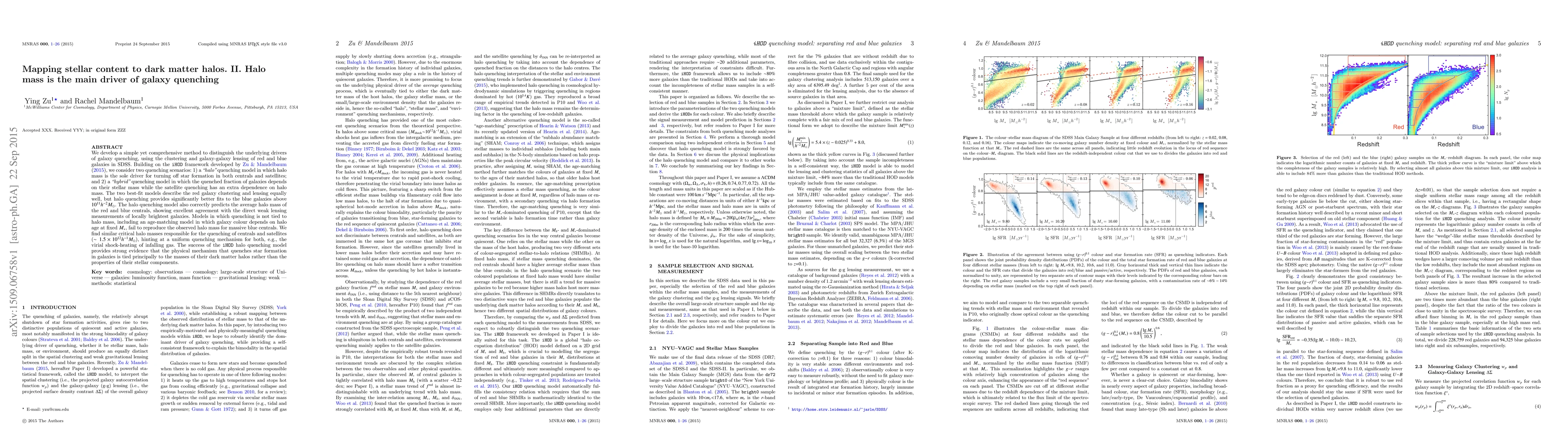 This paper uses galaxy clustering and lensing data from SDSS to determine that the primary driver of galaxy quenching is the mass of the dark matter halo, rather than stellar properties. The halo quenching model fits the observed data better, especially for massive blue galaxies, indicating a universal quenching mechanism linked to halo mass.