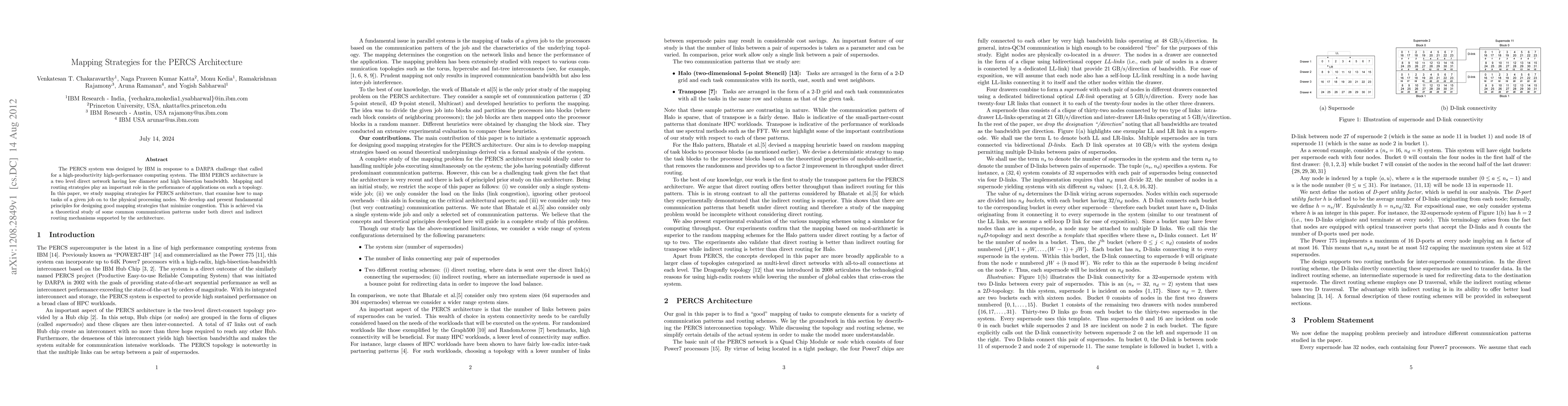 This paper investigates mapping strategies for the PERCS architecture, a high-performance computing system, to minimize congestion and optimize task placement on physical processing nodes. It develops fundamental principles for designing effective mapping strategies through theoretical studies of common communication patterns.