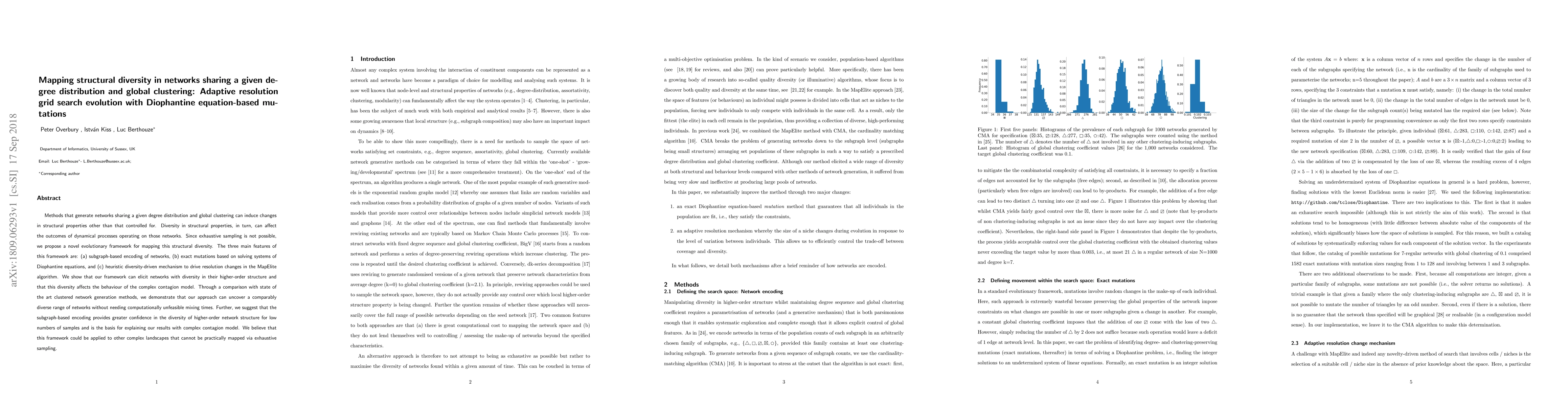 Methods that generate networks sharing a given degree distribution and global clustering can induce changes in structural properties other than that controlled for. Diversity in structural properties, in turn, can affect the outcomes of dynamical processes operating on those networks. Since exhaustive sampling is not possible, we propose a novel evolutionary framework for mapping this structural diversity. The three main features of this framework are: (a) subgraph-based encoding of networks, (b) exact mutations based on solving systems of Diophantine equations, and (c) heuristic diversity-driven mechanism to drive resolution changes in the MapElite algorithm. We show that our framework can elicit networks with diversity in their higher-order structure and that this diversity affects the behaviour of the complex contagion model. Through a comparison with state of the art clustered network generation methods, we demonstrate that our approach can uncover a comparably diverse range of networks without needing computationally unfeasible mixing times. Further, we suggest that the subgraph-based encoding provides greater confidence in the diversity of higher-order network structure for low numbers of samples and is the basis for explaining our results with complex contagion model. We believe that this framework could be applied to other complex landscapes that cannot be practically mapped via exhaustive sampling.